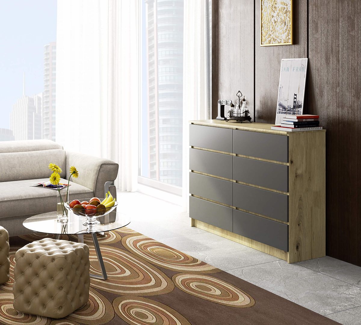 Komoda s 8 ladica u boji hrasta Artisan i sivoj. .. više