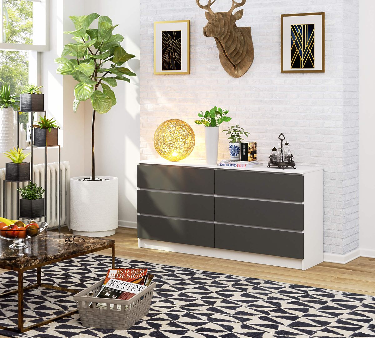 Komoda je komad namještaja koji je toliko univerzalan da se može koristiti u bilo kojoj prostoriji. Najčešće se pojavljuje u dnevnim boravcima, dječjim sobama, spavaćim sobama, blagovaonicama ili uredima. Komoda bi trebala izgledom odgovarati ostalom namještaju u aranžmanu i istovremeno se odlikovati solidnom i pažljivom izradom te funkcionalnošću. Predstavljeni proizvod K 160 cm je moderan model održavan u bezvremenskoj tonaciji. Kombinacija bijele i grafitno sive bez sumnje će privući osobe koje preferiraju minimalistički stil i interijere uređene u skandinavskom stilu. Komoda je opremljena sa šest prostranih ladica. Lako se otvara i zatvara. Pronaći će primjenu kako u stambenim, tako i u uredskim prostorima.