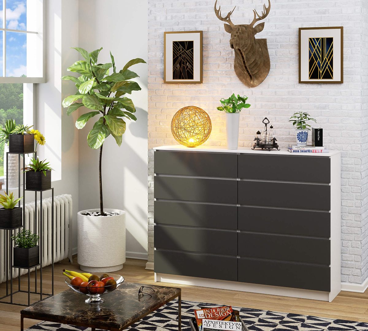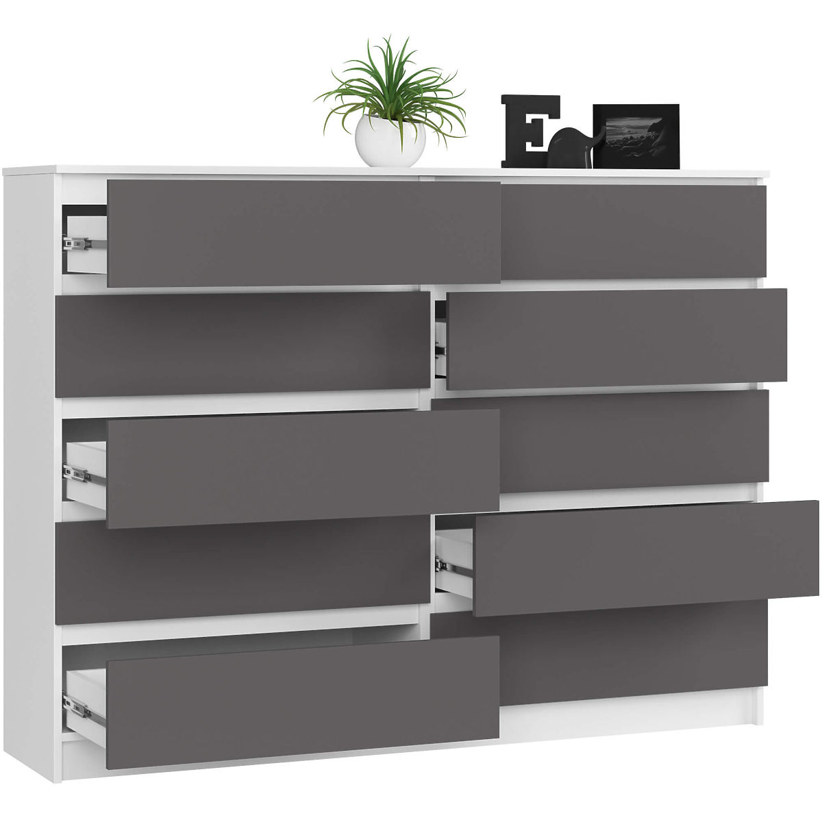 Komoda s 10 ladica od bijele i sive laminirane ploče. .. više