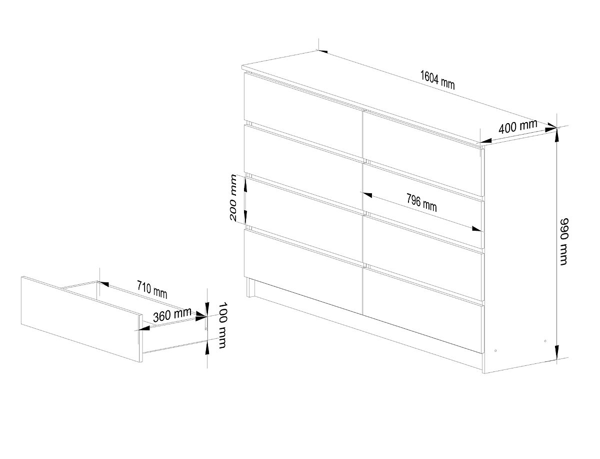 KOMODA K 160 cm 8 LADICA Izrađena od laminirane ploče debljine 16 mm otporne na habanje.