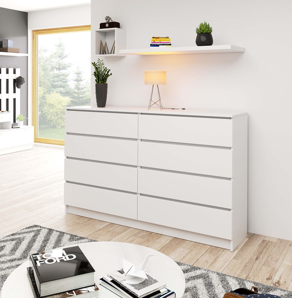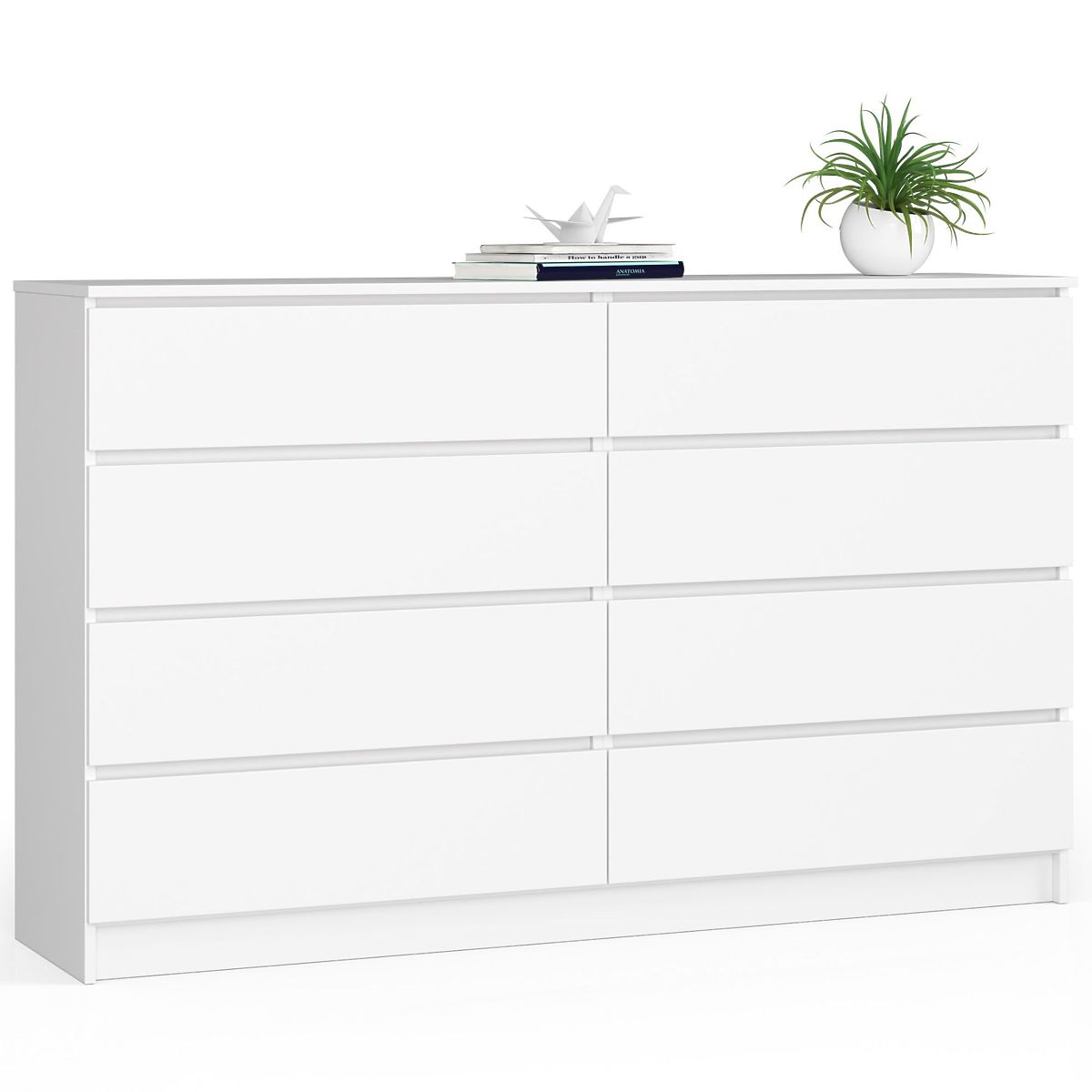 Bijela komoda namijenjena je svima koji cijene spoj udobnosti i funkcionalnosti. To se odražava u konstrukciji koja se sastoji od 8 širokih i dubokih ladica. Ovo rješenje je vrlo praktično jer omogućuje pohranu velike količine odjevnih predmeta i time štedi puno prostora u ormaru.