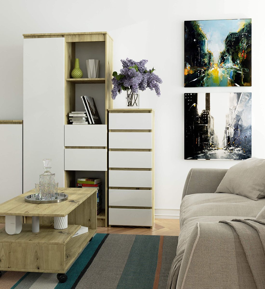 Komoda s 6 ladica u boji hrasta artisan i bijelim frontama. .. više