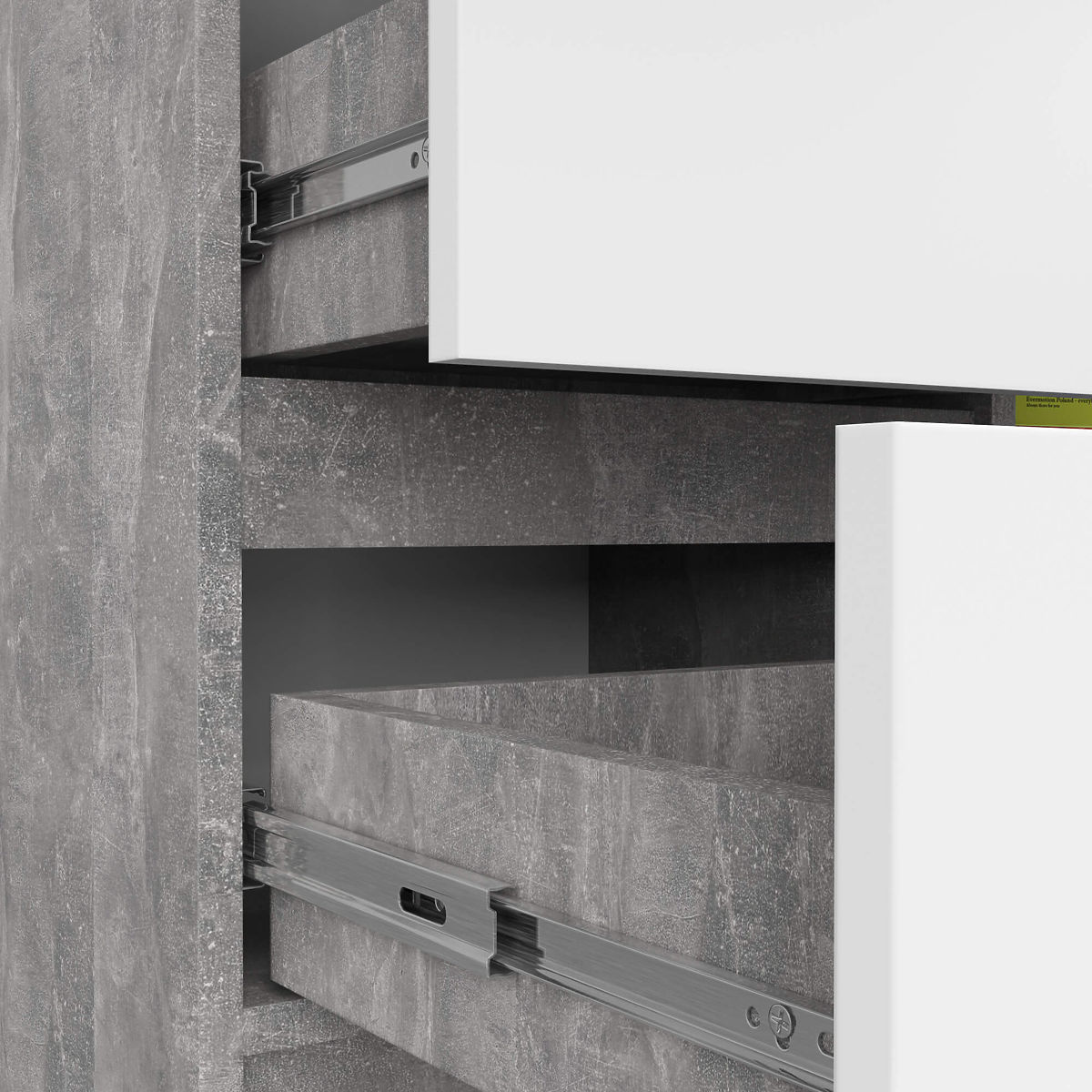 Mala komoda je element opreme koji će pronaći primjenu u svakoj prostoriji. Moderne boje, čvrsta konstrukcija i pažljiva izrada doveli su do stvaranja ormarića koji će se dokazati, na primjer, u predsoblju, dnevnom boravku ili u sobi za mlade, ali i u spavaćoj sobi. Može se koristiti i u uredskim prostorima, gdje omogućuje pohranu brojnih dokumenata i drugih uredskih potrepština. Komoda se sastoji od jednih vrata (unutra su dvije police) i 3 ladice. Namještaj kombinira boje betona i bijele.