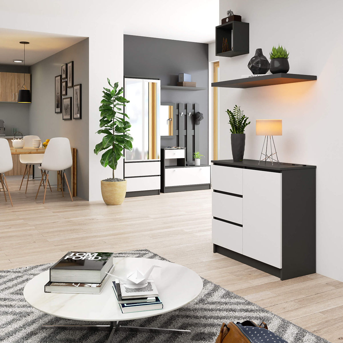 Mala komoda s grafitno sivim i bijelim bojama za svaku prostoriju. .. više