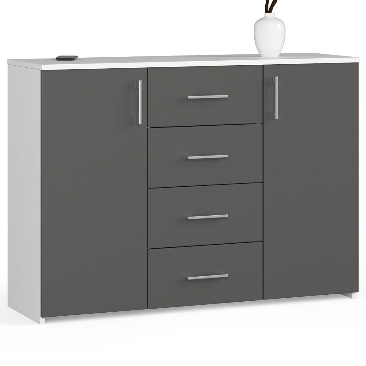Komoda bijela / grafitno siva je veliki i prostrani komad namještaja s mnogim korisnim funkcijama. S obje strane komode nalaze se vrata, iza kojih su 4 duboke police. Središnji dio namještaja također je vrlo funkcionalno dizajniran, jer je opremljen s 4 duboke ladice. Komoda stoga nudi puno prostora za pohranu.