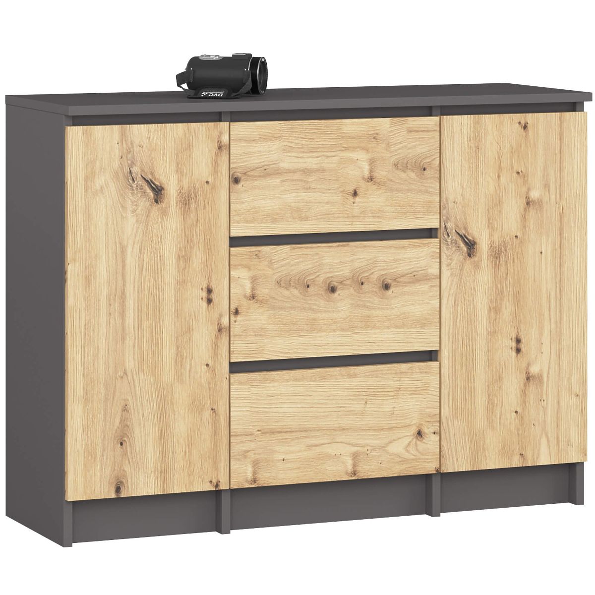 Komoda s tri ladice i dvije police, grafit siva i hrast artisan. .. više