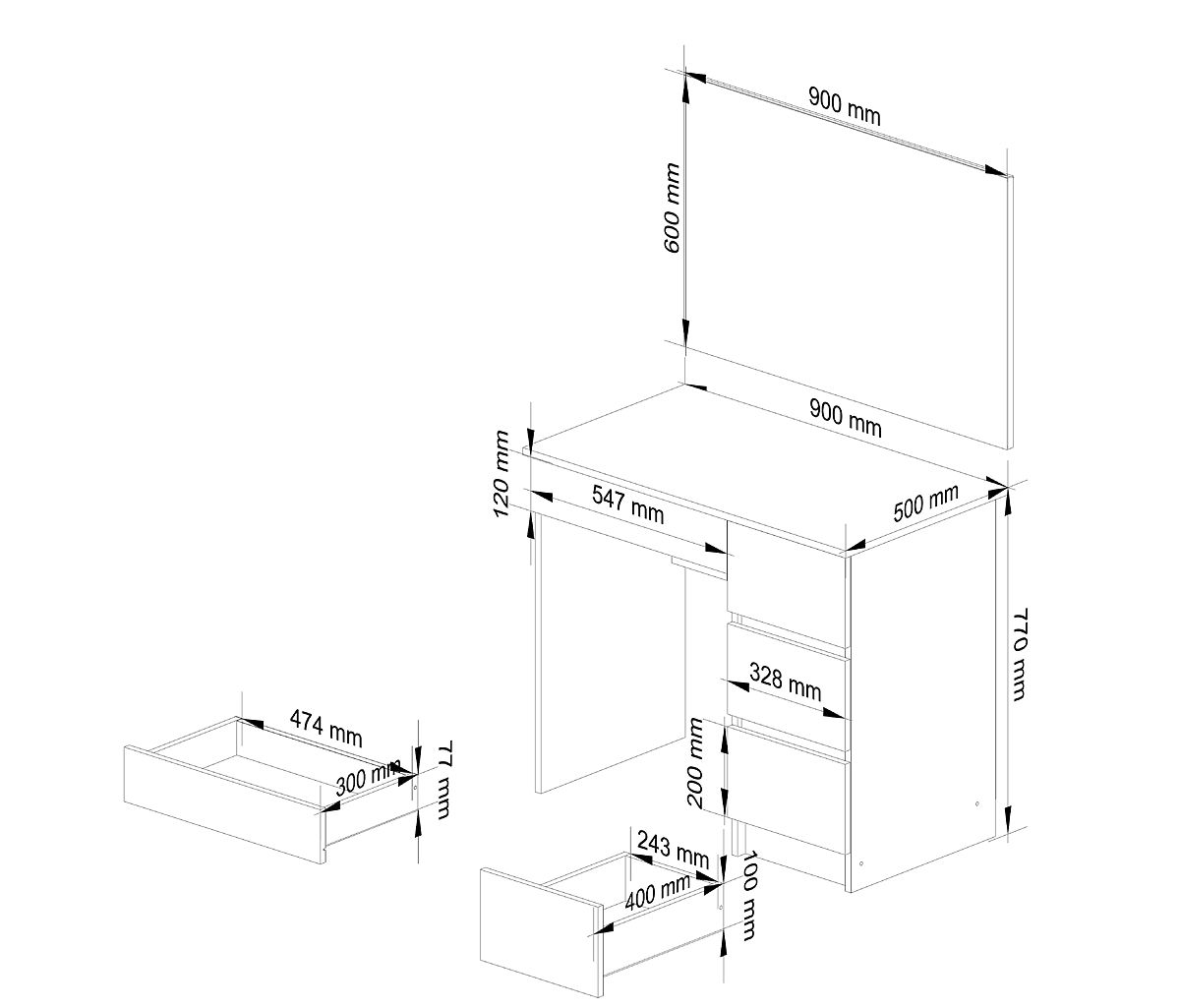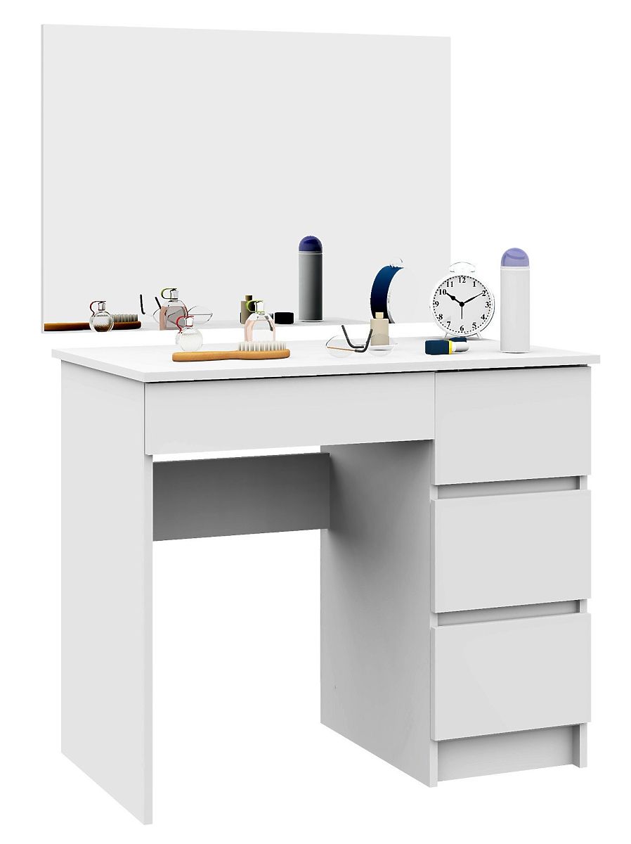 Kozmetički toaletni stol s ogledalom izvrstan je komad namještaja za šminkanje. Toaletni stol ima funkcionalnu ploču na koju se mogu staviti najpotrebnije stvari, i četiri prostrane ladice koje mogu primiti sve sitnice. U kompletu s prilagođenim ogledalom, toaletni stol stvara idealne uvjete za šminkanje i svakodnevna ženska rutina bit će od sada mnogo ugodnija. Prikladne dimenzije toaletnog stola (77 cm visina, 90 cm širina, 50 cm dubina) osiguravaju udobno kretanje i korištenje toaletnog stola. Veliko ogledalo (60 cm x 90 cm) omogućuje precizno izvođenje i najsloženijih kozmetičkih zadataka. Ovaj set će se pokazati korisnim čak i u malom prostoru. Toaletni stol je izrađen od izdržljive, protiv abrazije i oštećenja otporne laminirane ploče, a neutralna, moderna bijela boja uklapa se u svaki interijer. Idealan namještaj za spavaću sobu ili drugu prostoriju, koji će oduševiti svaku ženu koja brine o ljepoti.