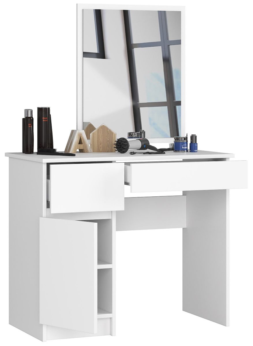 Toaletni stolić s ogledalom u bijeloj boji s ladicama i prostranim mjestom iza vrata. Lijeva konfiguracija.