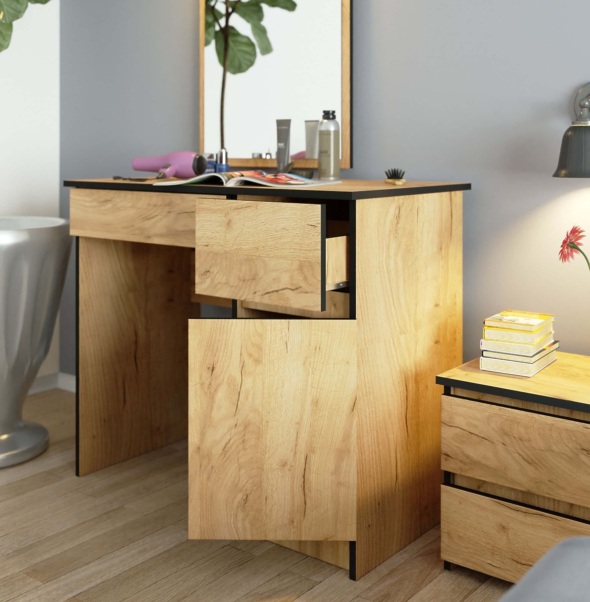 Kozmetički toaletni stol s ogledalom u boji hrasta craft s ladicama i prostranim prostorom iza vrata.