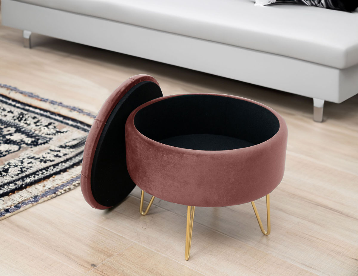 Tabure ili puf je izvrstan dodatak dnevnoj sobi ili spavaćoj sobi. Zahvaljujući njemu, umorne noge nakon cjelodnevnog hodanja mogu se odmoriti, a kada je puf izrađen od mekog velura, to samo pojačava ugodan osjećaj odmora. Moderan izgled dopunjuju metalne noge obojene u zlatnu boju, koja je ove godine tako moderna. Otvorivi poklopac omogućuje pristup prostoru za pohranu, gdje se mogu smjestiti predmeti koji nisu svakodnevno potrebni.Specifikacije: