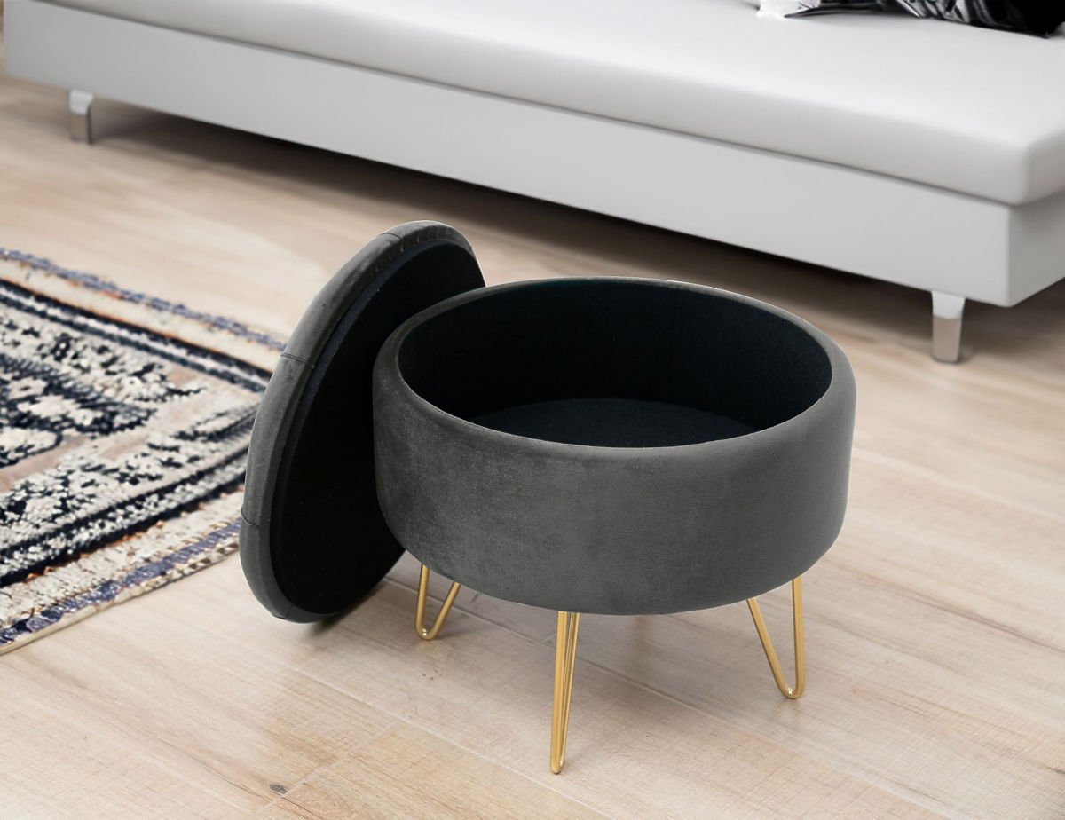 Puf s prostorom za pohranu na metalnim nogama u zlatnoj boji.