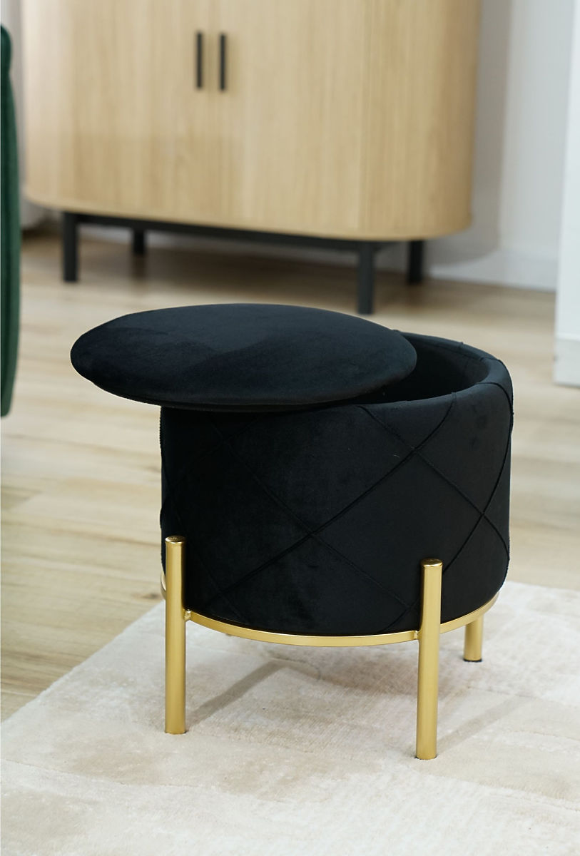 Puf s prostorom za pohranu na metalnim nogama zlatne boje.