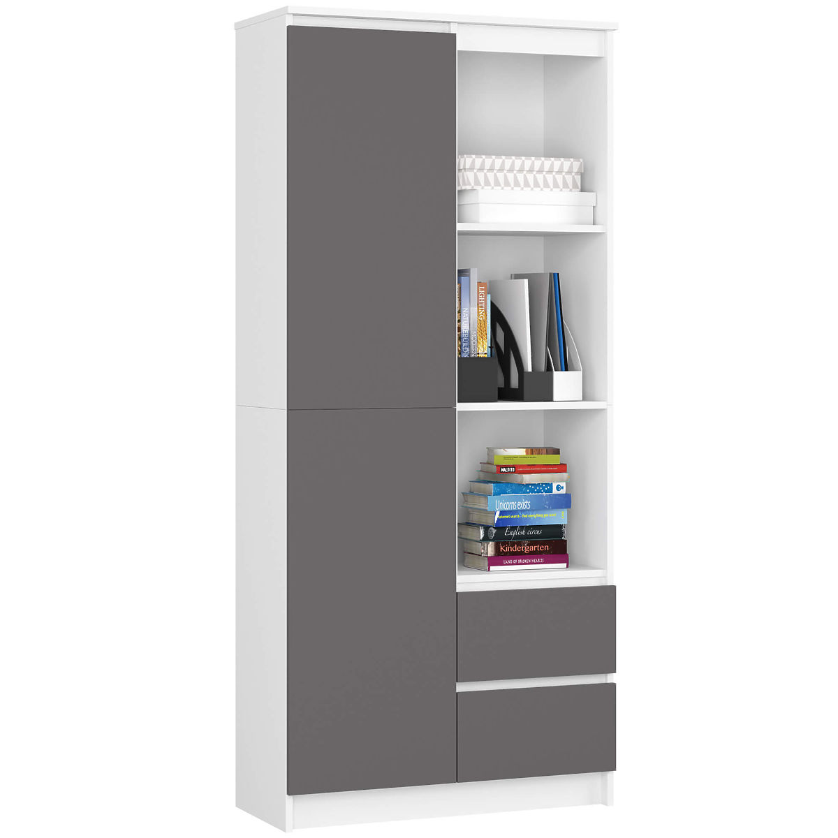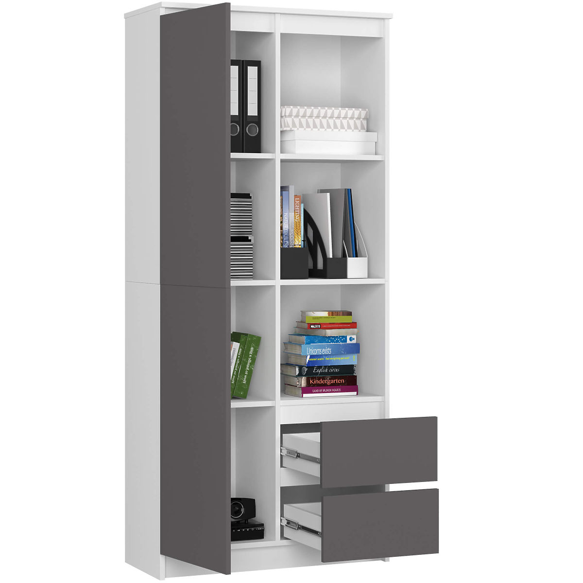 Uredski regal s vratima i ladicama u kombinaciji bijele i grafitno sive boje.