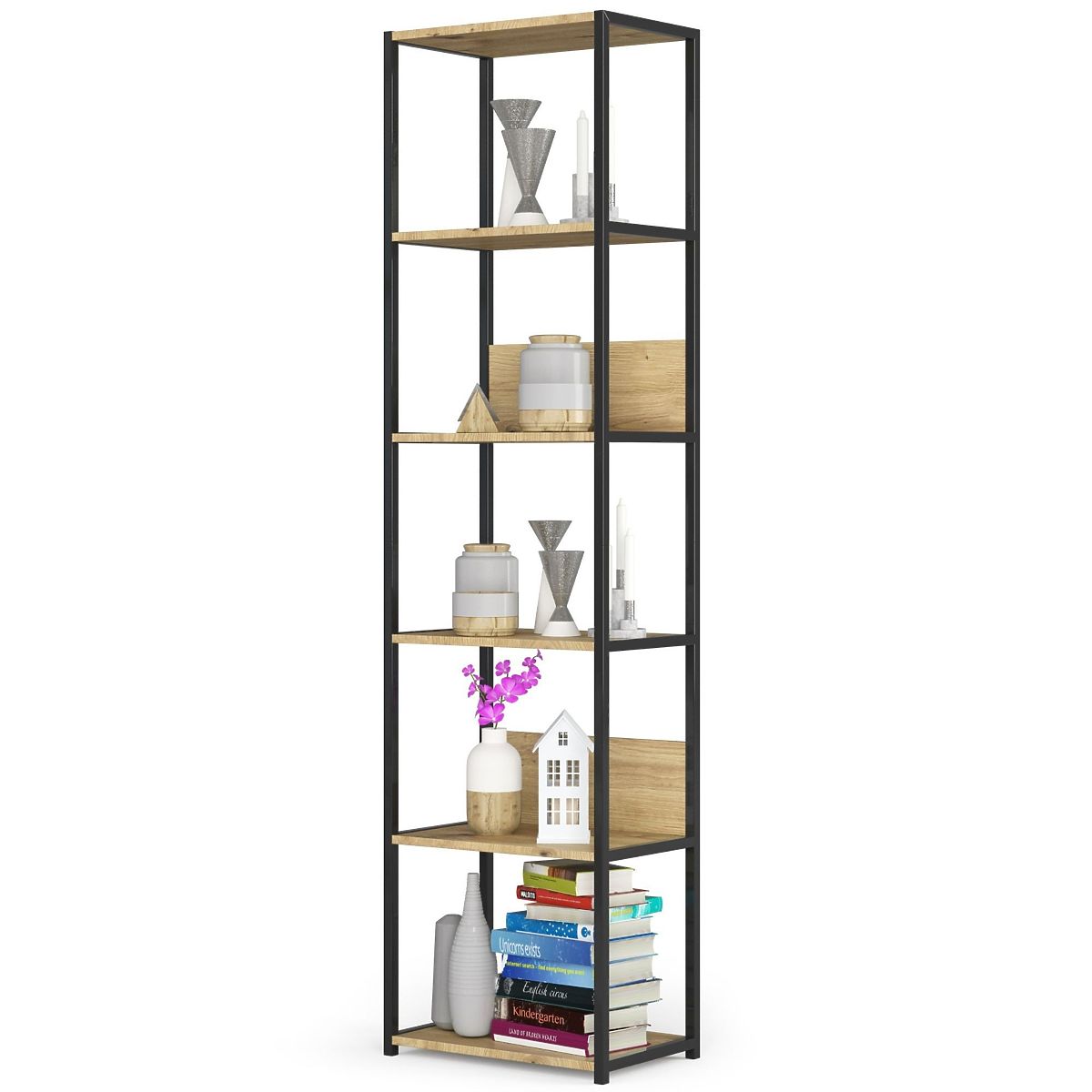 Metalni loft regal je praktičan i moderan komad namještaja koji je prikladan kako za dnevni boravak, tako i za ured. Regal s crnim metalnim okvirom i 6 polica u boji Dub Artisan. Police regala izrađene su od laminirane ploče debljine 16 mm. To je izdržljiv i čvrst materijal koji se odlikuje visokom otpornošću na habanje. Rubovi su dodatno zaštićeni ABS rubom, zahvaljujući čemu će namještaj i dalje izgledati dobro, čak i pri vrlo intenzivnoj svakodnevnoj upotrebi. Regal je opremljen s 6 polica na koje možete smjestiti predmete koje želite izložiti ili imati jednostavno pri ruci. Ukupno, djeluje vrlo elegantno i moderno.