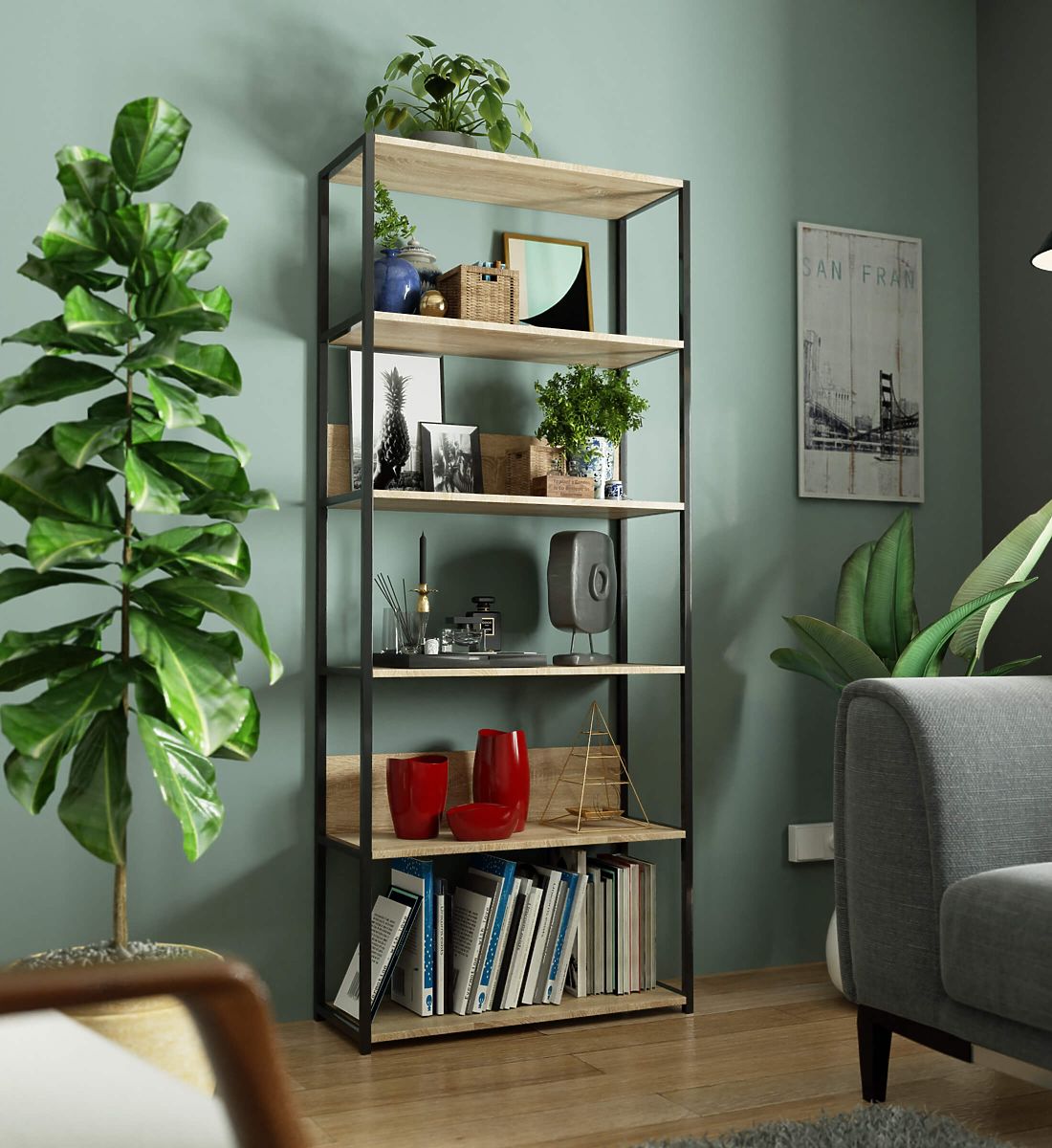 Metalna loft polica je praktičan i moderan namještaj koji se uklapa kako u dnevni boravak, tako i u ured. Polica s crnim metalnim okvirom i 6 polica u boji hrast sonoma. Police su izrađene od laminirane ploče debljine 16 mm. To je izdržljiv i otporan materijal koji se odlikuje visokom otpornošću na habanje. Rubovi su dodatno zaštićeni ABS rubom, zahvaljujući čemu će namještaj izgledati dobro čak i uz vrlo intenzivnu svakodnevnu upotrebu. Polica je opremljena s 6 polica na koje se mogu smjestiti predmeti koje želimo izložiti ili imati pri ruci. Ukupno djeluje vrlo elegantno i moderno.