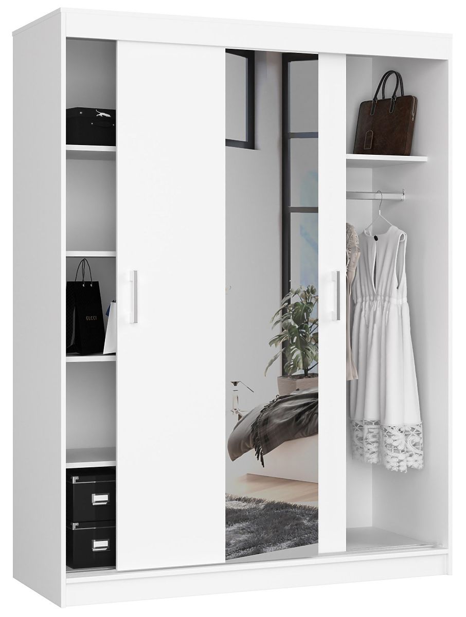 Dvodijelni klizni ormar 150 cm CLP s ogledalom je bijeli dizajn koji će se sigurno uklopiti u spavaću sobu, predsoblje ili sobu za mlade. Namještaj omogućuje pohranu odjeće i mnogih drugih predmeta, pruža prostor za vješanje jakni, sakoa, košulja, haljina ili dugih kaputa te praktične police. Ovaj dizajn kombinira elegantan, minimalistički izgled i visoku kvalitetu, koja je rezultat kvalitetnih materijala i pažnje na sve detalje. Namještaj je opremljen velikim ogledalom koje može optički povećati prostoriju.