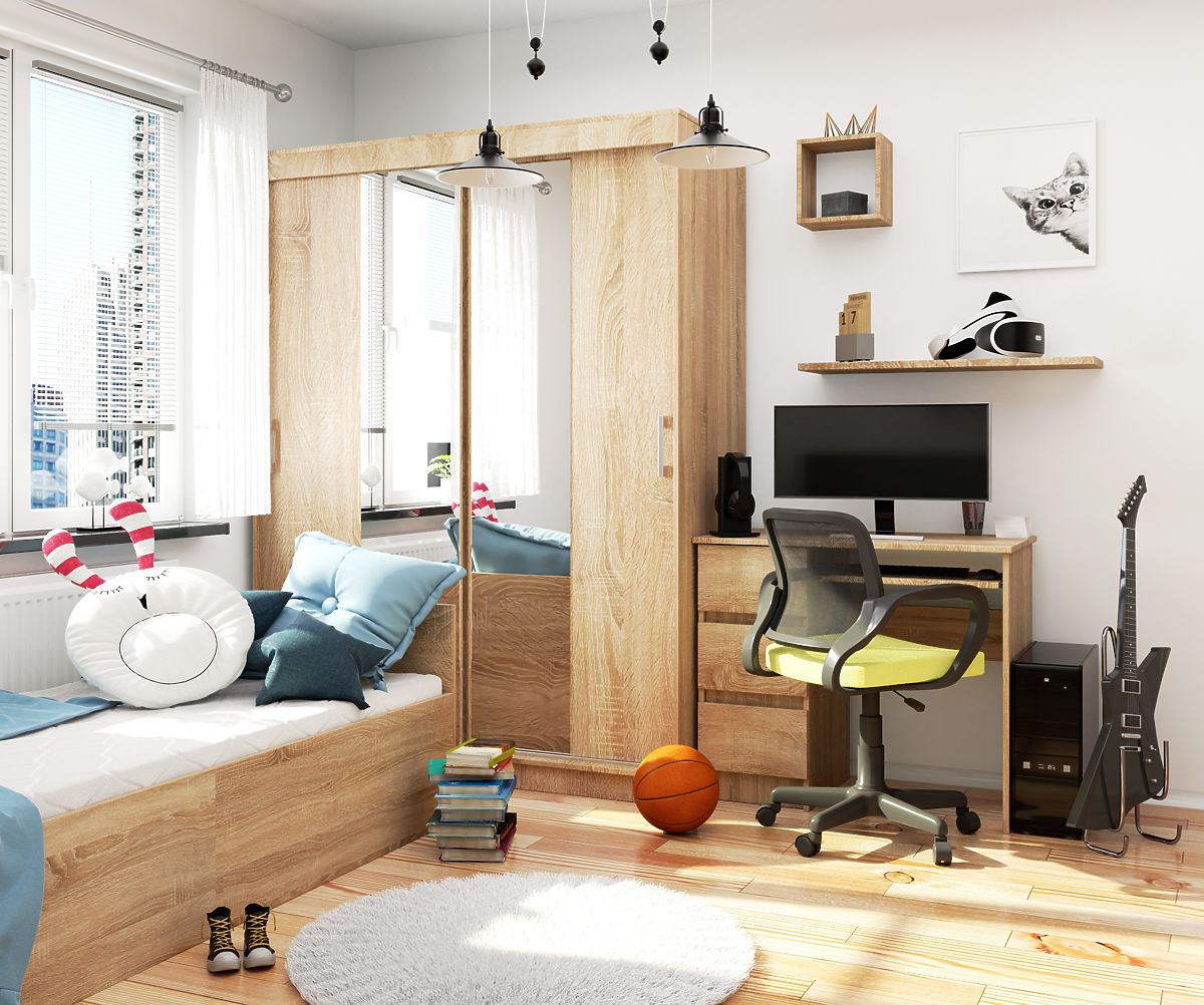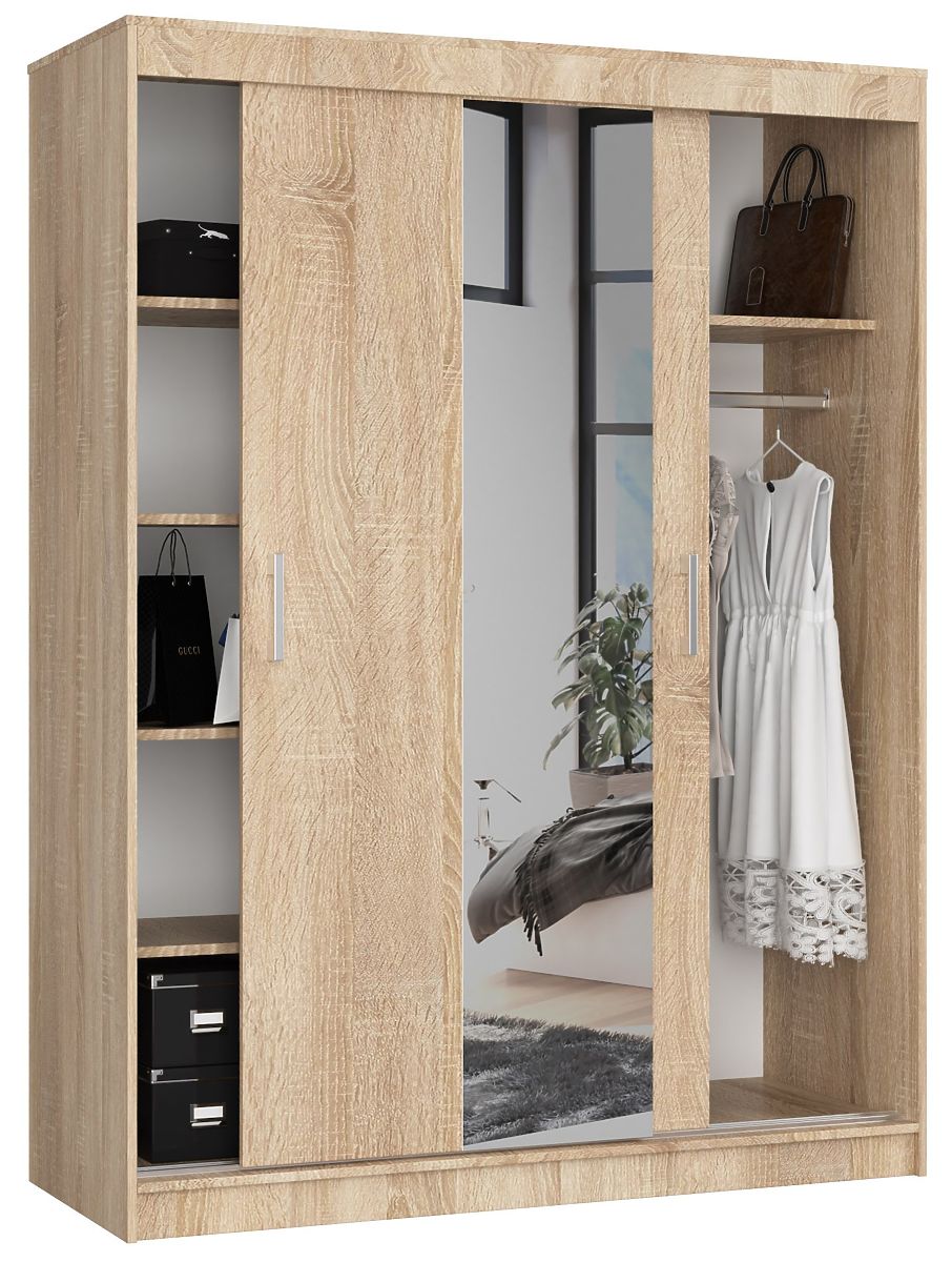 Prostrani ormar u boji hrasta sonoma, s kliznim vratima i ogledalom, univerzalan je i bezvremenski namještaj koji će ispuniti svoju funkciju u gotovo svakoj stambenoj prostoriji. Odlično se uklapa u dječju i omladinsku sobu, kao i u spavaću sobu ili garderobu. U prikladno velikom predsoblju može služiti kao ormar za gornju odjeću i druge potrepštine potrebne u kućanstvu.