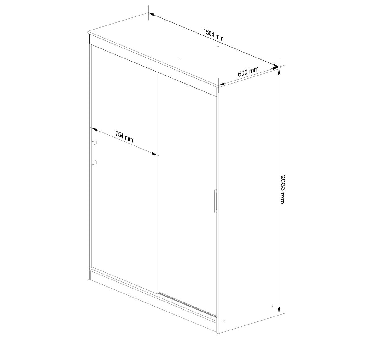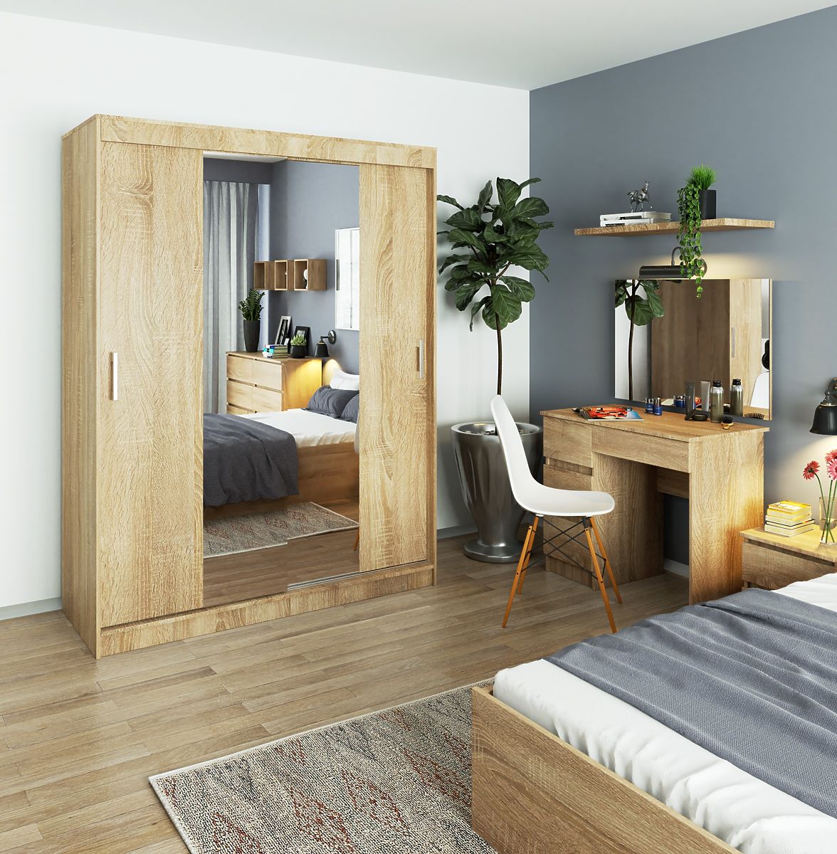 Ormar s kliznim vratima i ogledalom smještenim u srednjem dijelu namještaja izrađen je od visokokvalitetne, otporne na habanje laminirane ploče Kronospan. I korpus namještaja, kao i djelomično svaka od 2 vrata koja se kreću na metalnim vodilicama, održavaju se u toploj boji hrasta sonoma. Unutrašnjost ormara funkcionalno je podijeljena na 2 dijela. Na lijevoj strani nalaze se prostrane police (5 komada). Desni dio ormara čini prostor za vješanje odjeće. U njemu je instalirana jedna gornja polica, ispod koje je pričvršćena metalna šipka.