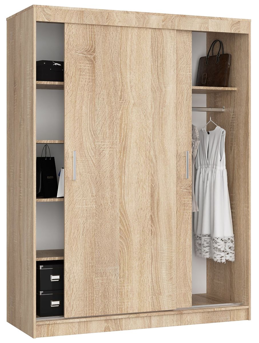 Prilikom kupnje ormara vodimo se time da bude praktičan i da primi što više naše odjeće i dodataka. Ove uvjete svakako ispunjava naš klizni ormar CLP visine 200 cm i širine 150 cm! Zahvaljujući 6 dubokih polica i šipki, bez problema ćete pohraniti ne samo obične majice, već i elegantne haljine, odijela ili sakoe. Čime se još naš ormar ističe? Izvedba u boji hrasta sonoma idealno se uklapa u jednostavne, minimalističke, skandinavske interijere. Također će se dobro slagati s bijelim zidovima.