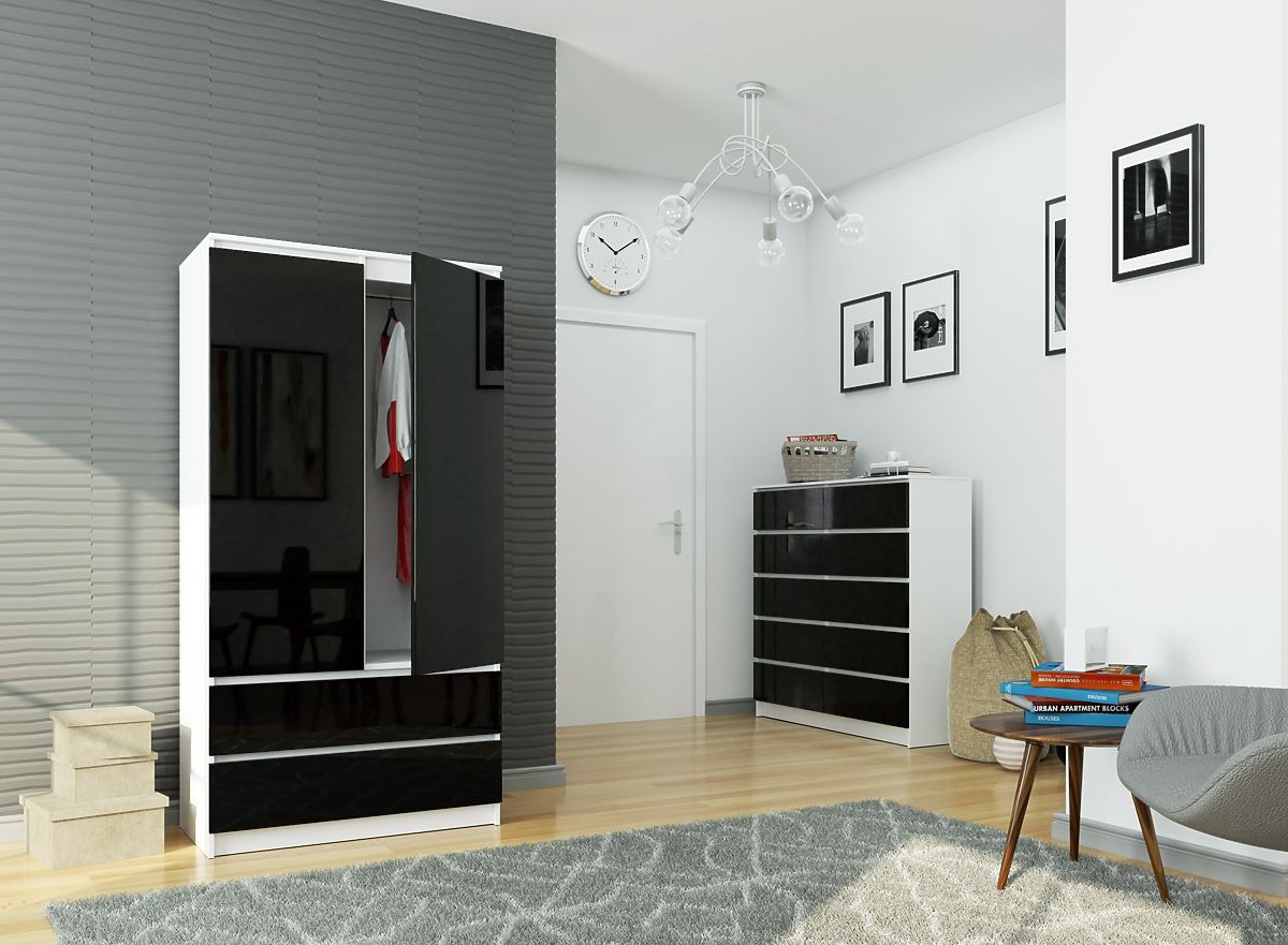 Namještaj se odlikuje prilično jednostavnom konstrukcijom, ali mu se ne može osporiti funkcionalnost. U gornjem dijelu sastoji se od četiri police i mjesta za vješanje odjeće s posebno montiranom šipkom, dok u donjem dijelu ima dvije ladice na metalnim kugličnim vodilicama GTV. Upotrijebljena rješenja čine ormar – iako izgleda lagano – iznimno prostranim. U prikazanom modelu kombinacija dviju suprotnih boja – duboke crne i sirove bijele – daje cijelom setu eleganciju i moderan izgled, što je dodatno naglašeno upotrebom visokog sjaja.