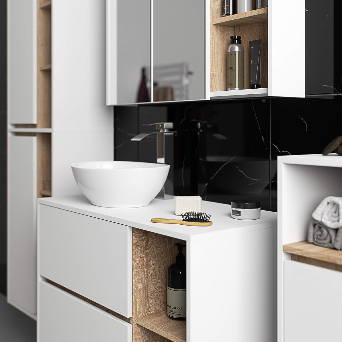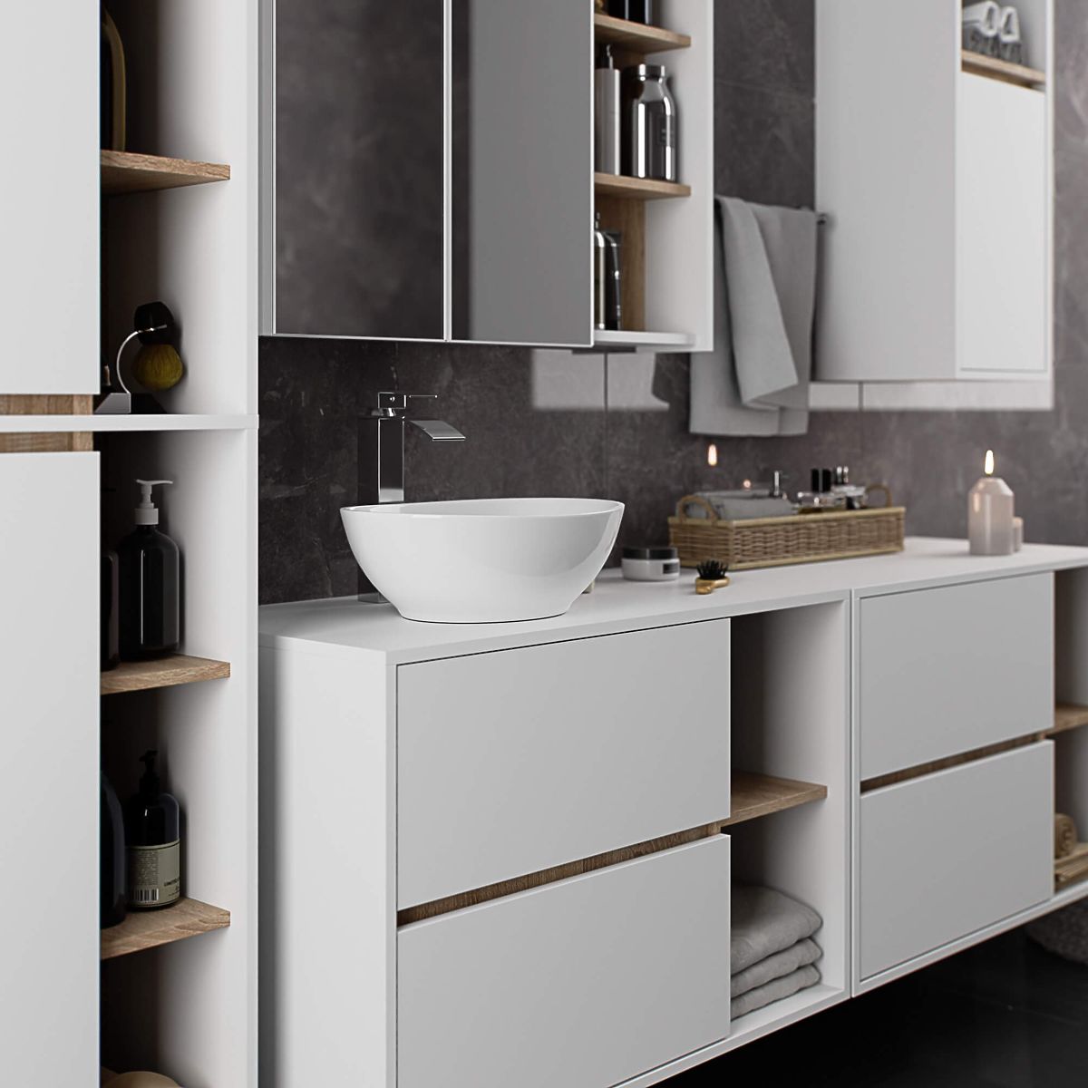 Kupaonski ormarići savršeno nadopunjuju opremu kupaonice, osiguravajući potreban prostor za sve kozmetičke proizvode i deterdžente te dajući kupaonici određeni stil. Prostrani ormarići olakšavaju održavanje reda u prostoriji, što pozitivno utječe na estetiku interijera. Kolekcija VAMI ističe se privlačnom stilskom paletom boja – korpus i frontovi su iste boje, dok je unutarnja boja drugačija.