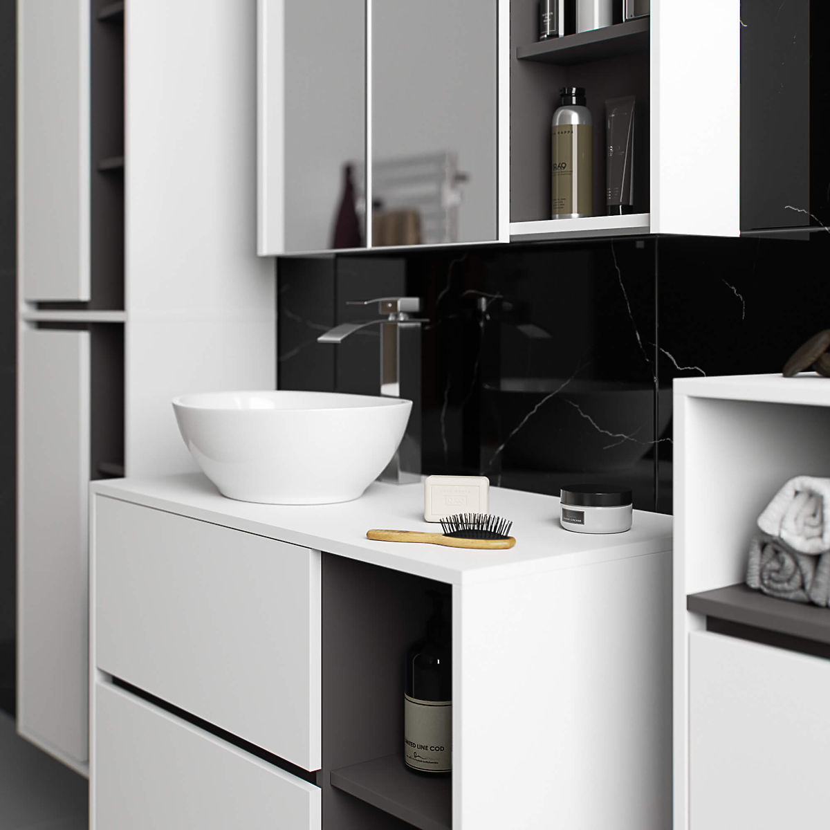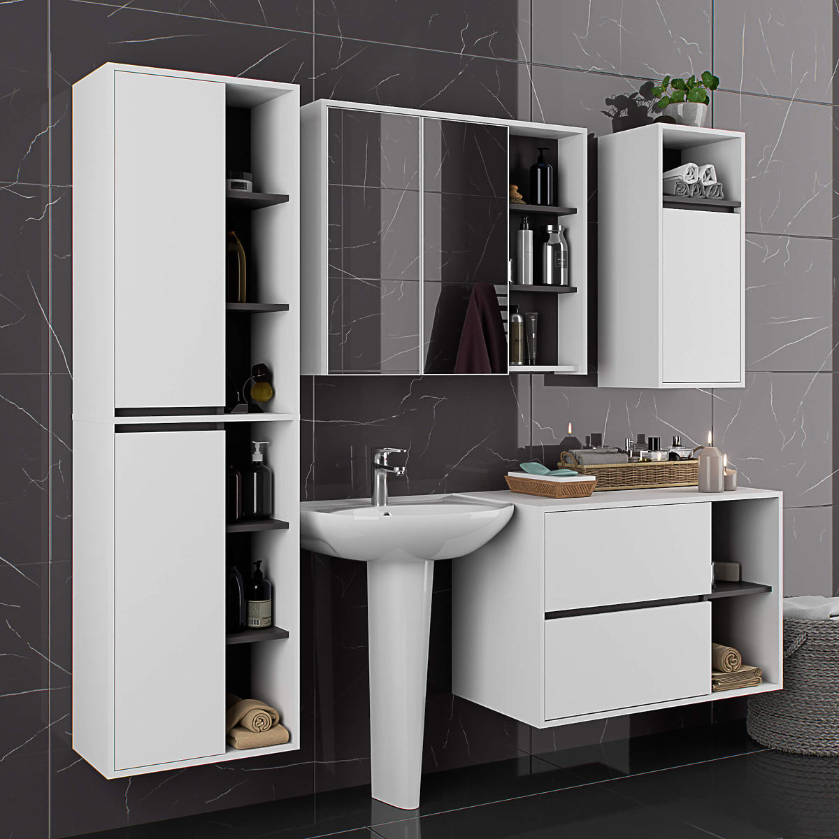 Kupaonski ormarići savršeno nadopunjuju opremu kupaonice, osiguravajući potreban prostor za sve kozmetičke proizvode i deterdžente te dajući kupaonici određeni stil. Prostrani ormarići olakšavaju održavanje reda u prostoriji, što povoljno utječe na estetiku unutrašnjosti. Kolekcija VAMI ističe se privlačnom stilskom paletom boja – korpus i frontovi su iste boje, dok je unutarnja boja drugačija.