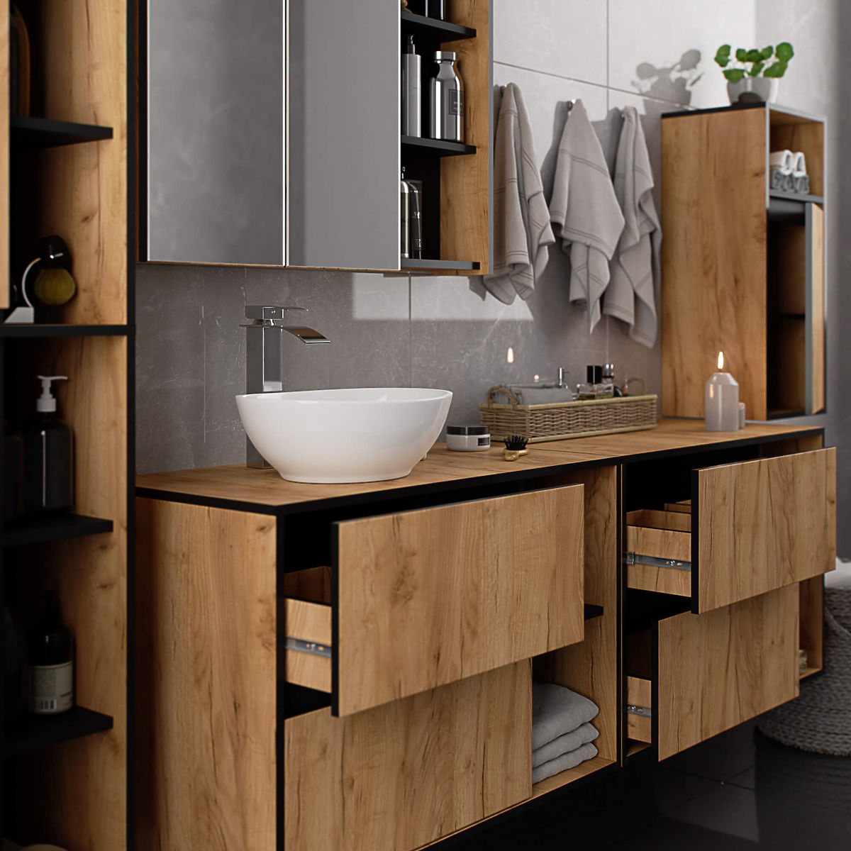 Viseći ormarić za kupaonicu ispod umivaonika 90 cm VAMI W90 savršeno se uklapa u moderan interijer. Konfiguracija s 2 ladice i 2 otvorene police nudi veliku udobnost pri korištenju. U prostrane ladice mogu se pohraniti higijenski i kozmetički proizvodi, dok se na otvorene police mogu postaviti dekoracije koje će interijeru dati osobniji karakter. Ovaj model visećeg ormarića ispod umivaonika ima 2 otvora u ploči namijenjena za montažu umivaonika i sifona. Ormarić također ima posebno oblikovane ladice koje omogućuju instalaciju sifona i hidrauličkih elemenata. PAŽNJA! Namještaj se isporučuje bez umivaonika i armature.