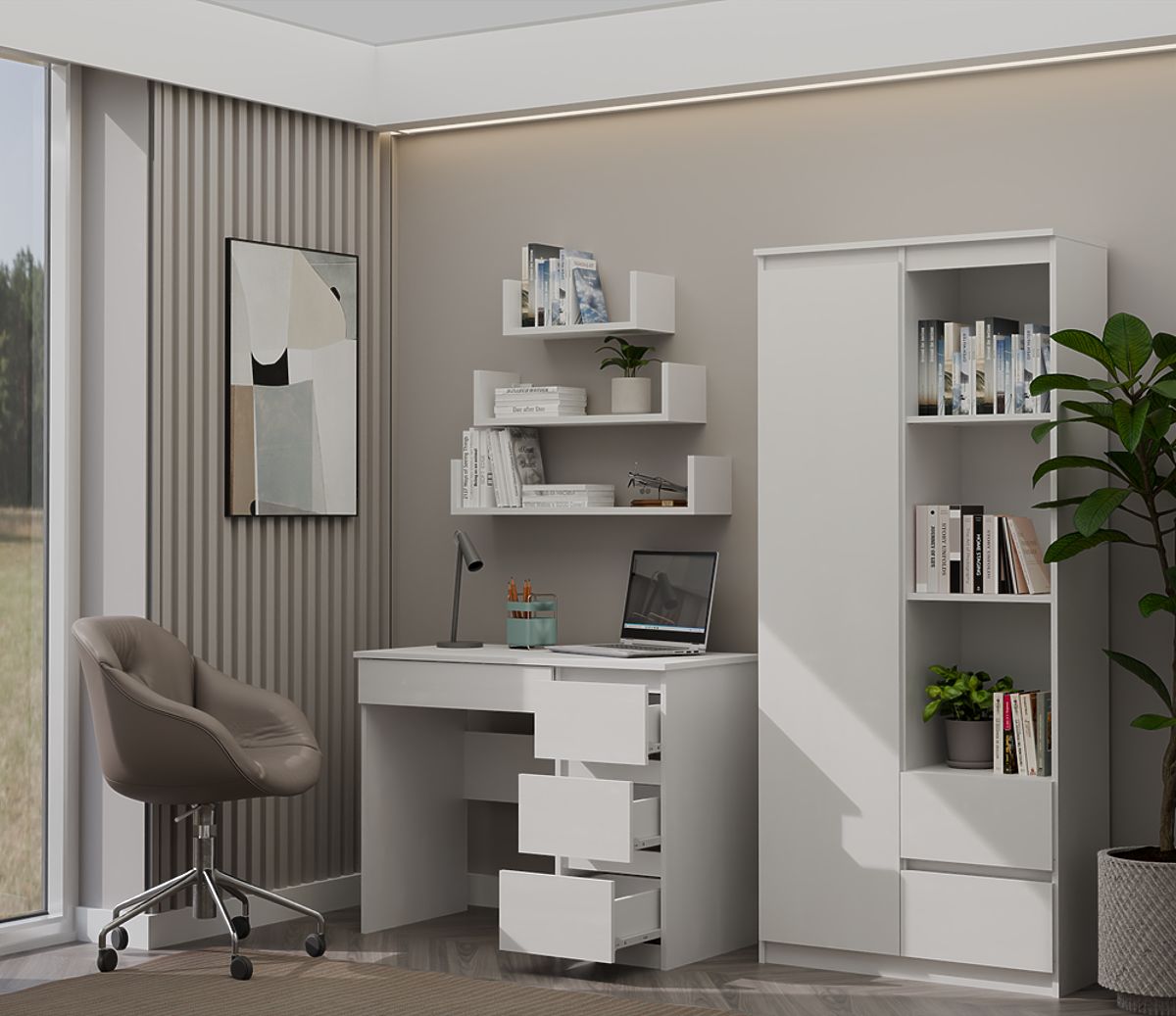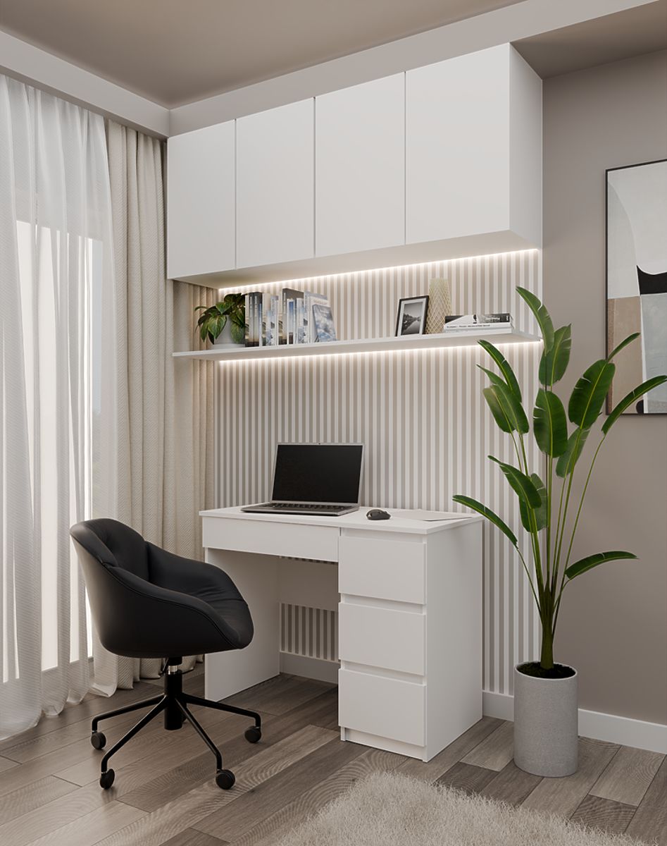 BOJA: BIJELA Model stola "MIJAS" savršen je i za kućne sobe i za urede. idealno mjesto za prijenosno računalo fronte ladica bez ručki 3 prostrane visoke ladice s lijeve strane i jedna niska s desne strane ispod ploče stola funkcionalnost jednostavan i moderan dizajn stvara udoban radni prostor glatke stranice bez poklopaca jednostavna montaža upute za montažu u pakiranju češki proizvođač (ako želite, mogu dodati "poljskog proizvođača" - napišite što želite) MATERIJAL: Korpus i fronte - laminirana iverica 16 mm.