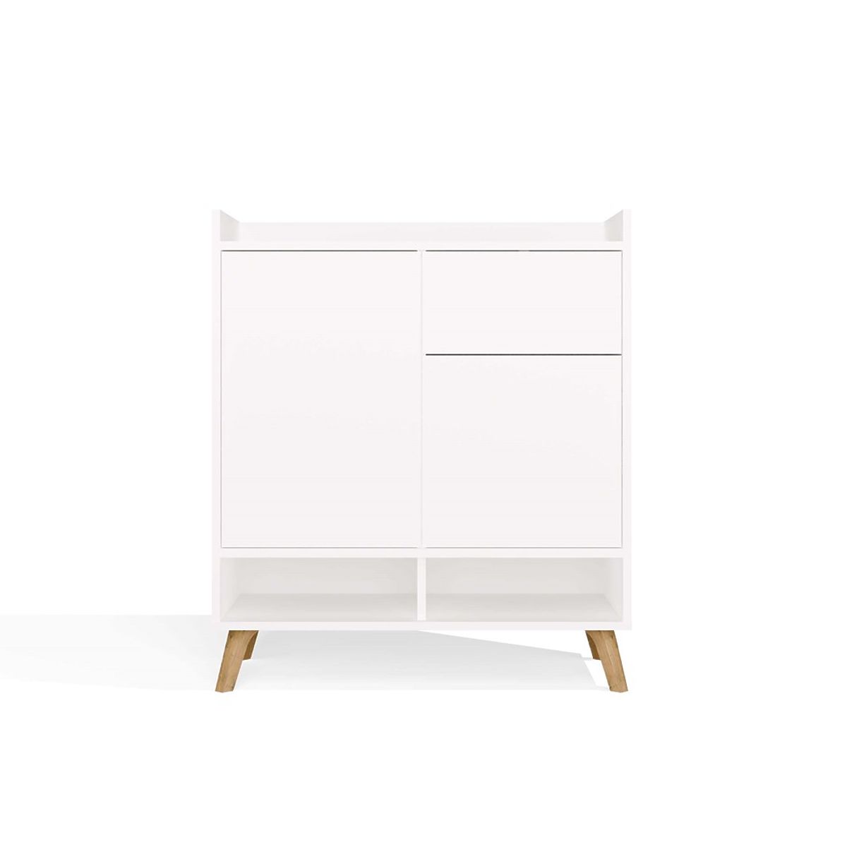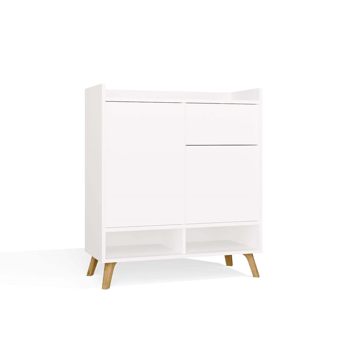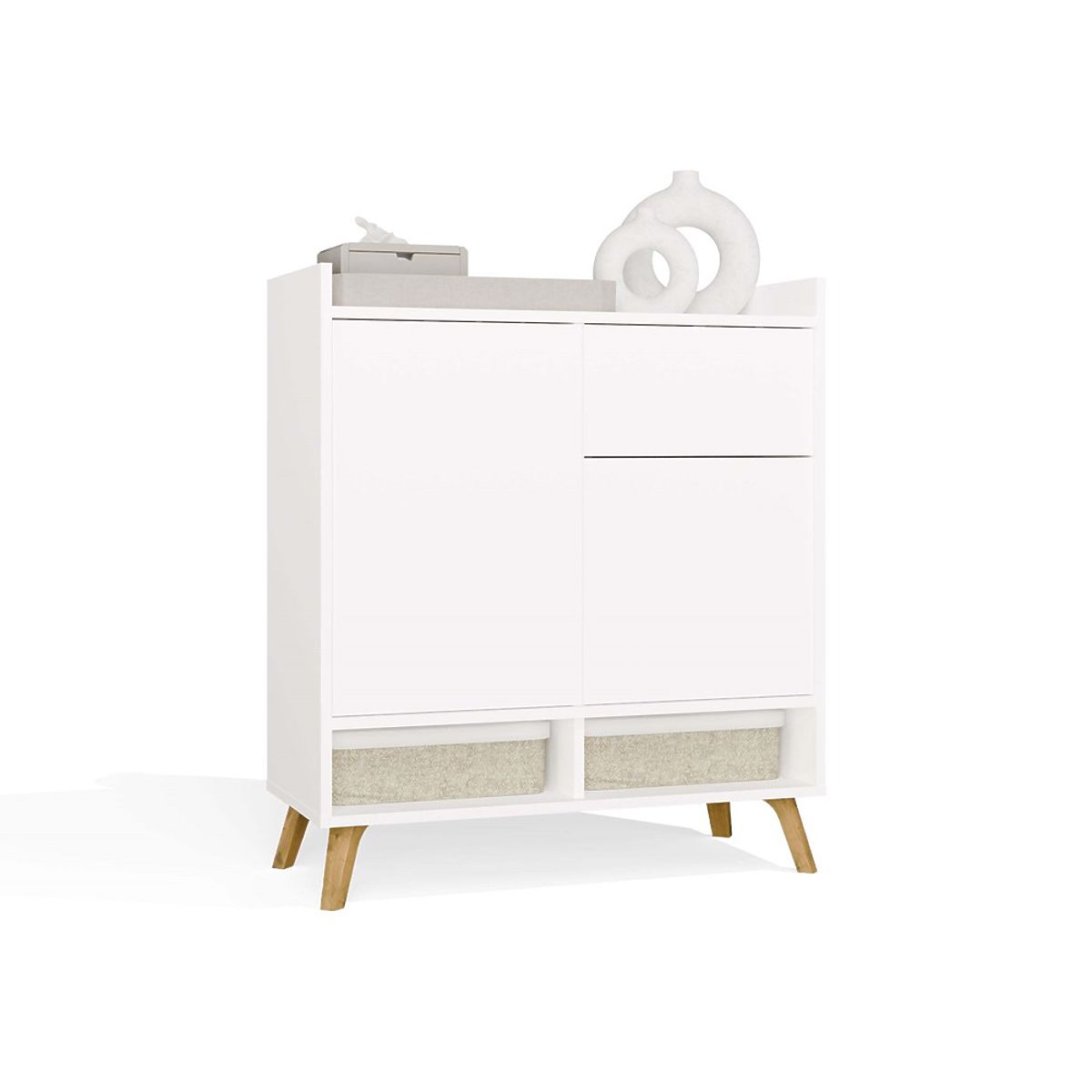 Jednostavan oblik, frontovi bez ručki i visoke noge u skandinavskom stilu daju komodi lakoću i moderan karakter.
