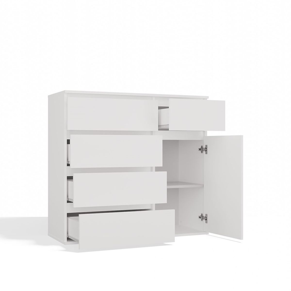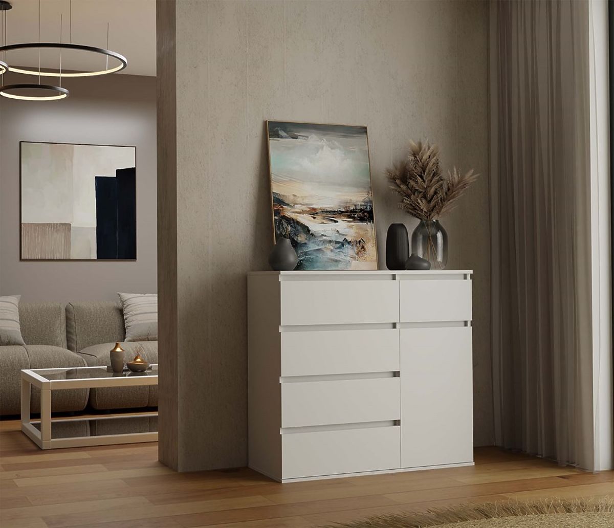 Komoda 1D5S u bijeloj boji je elegantan i funkcionalan komad namještaja, idealan za spavaću sobu, dnevni boravak, hodnik ili dječju sobu.