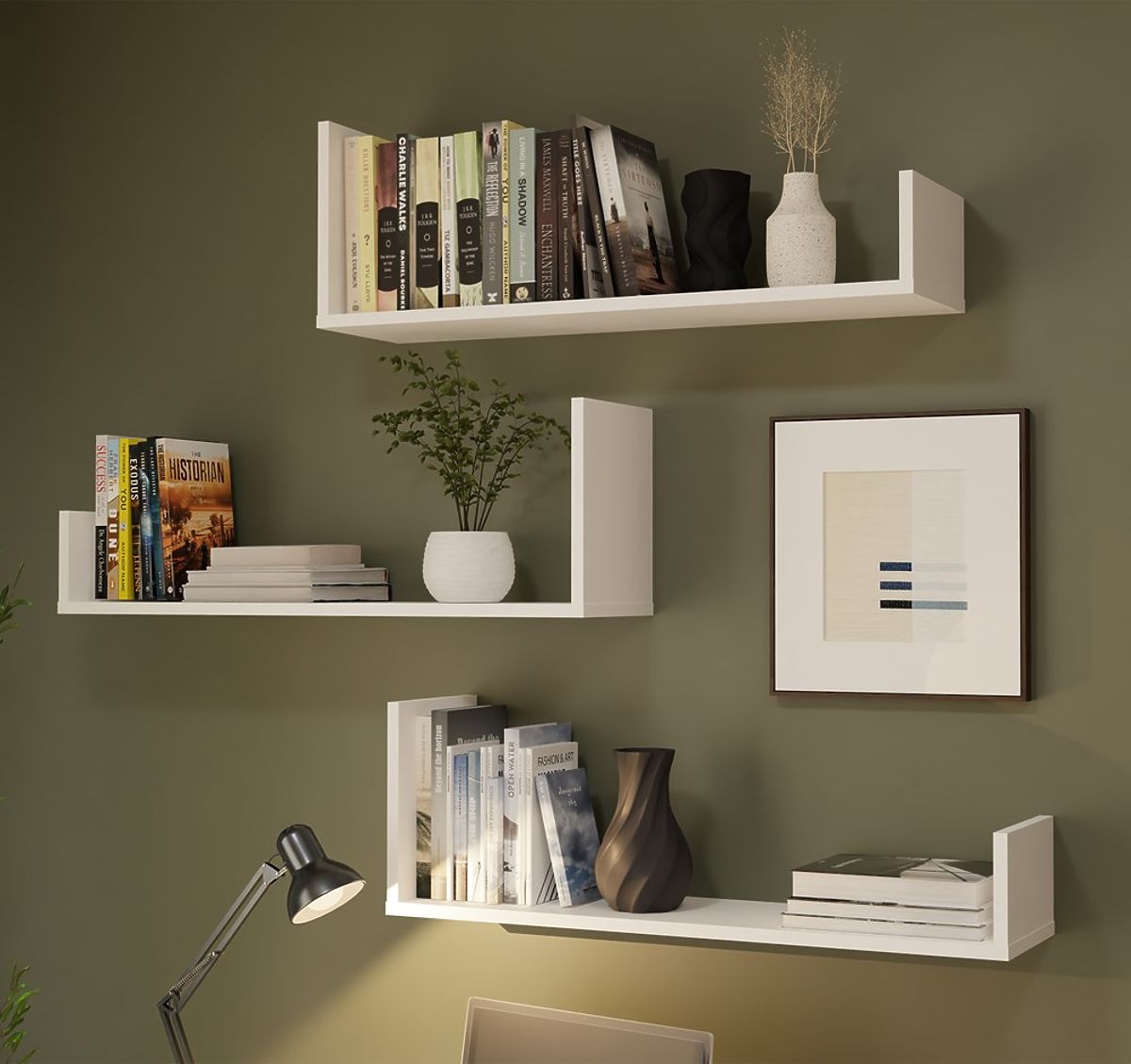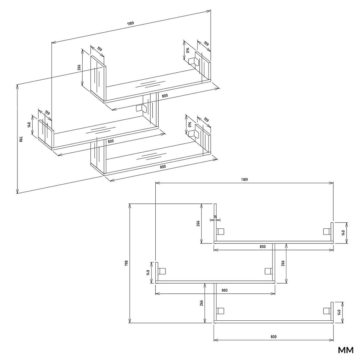 3 neovisne zidne police za montažu u bilo kojem rasporedu, prikazano na fotografijama je primjer