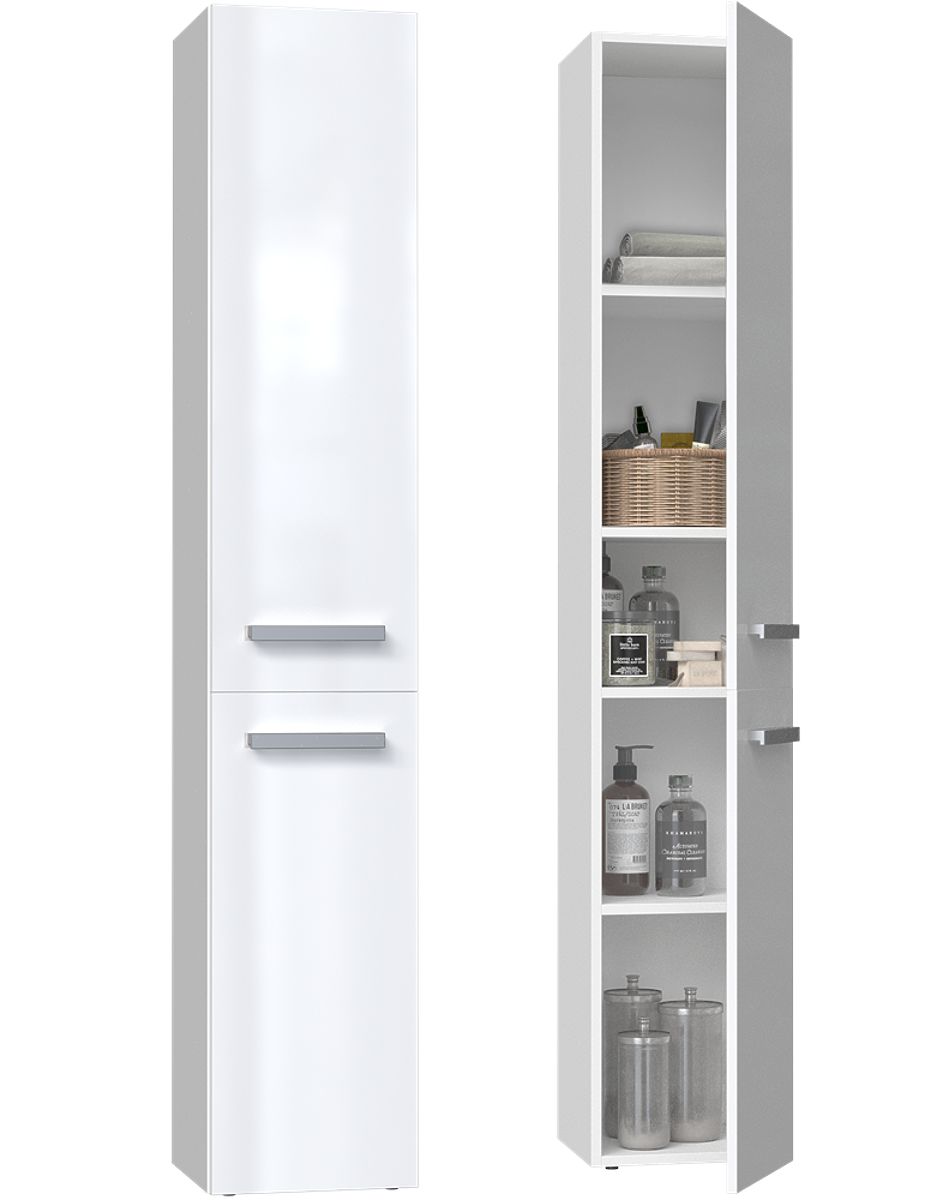 Kupaonski ormarić s bijelim sjajem i dugim vratima. .. više