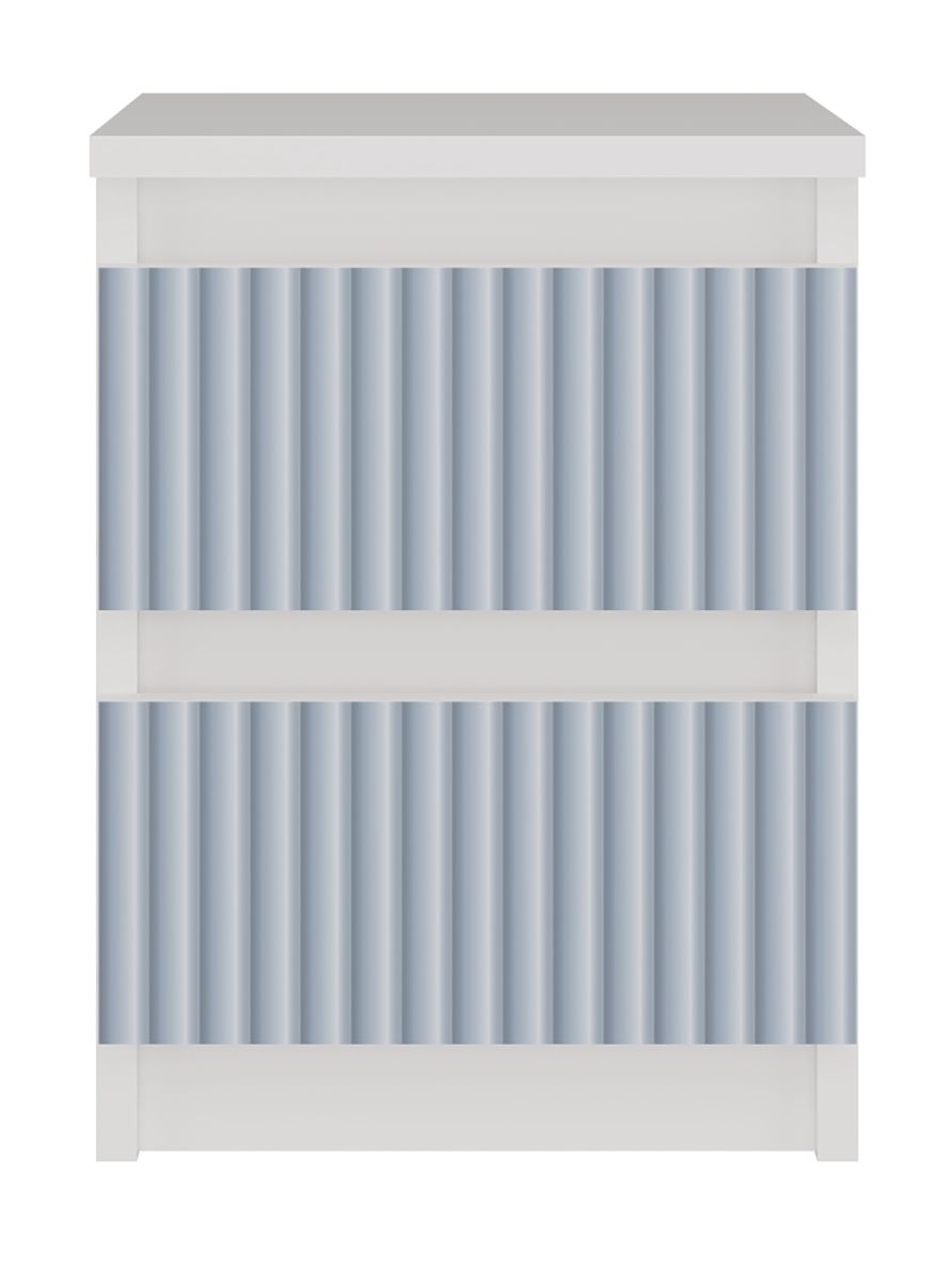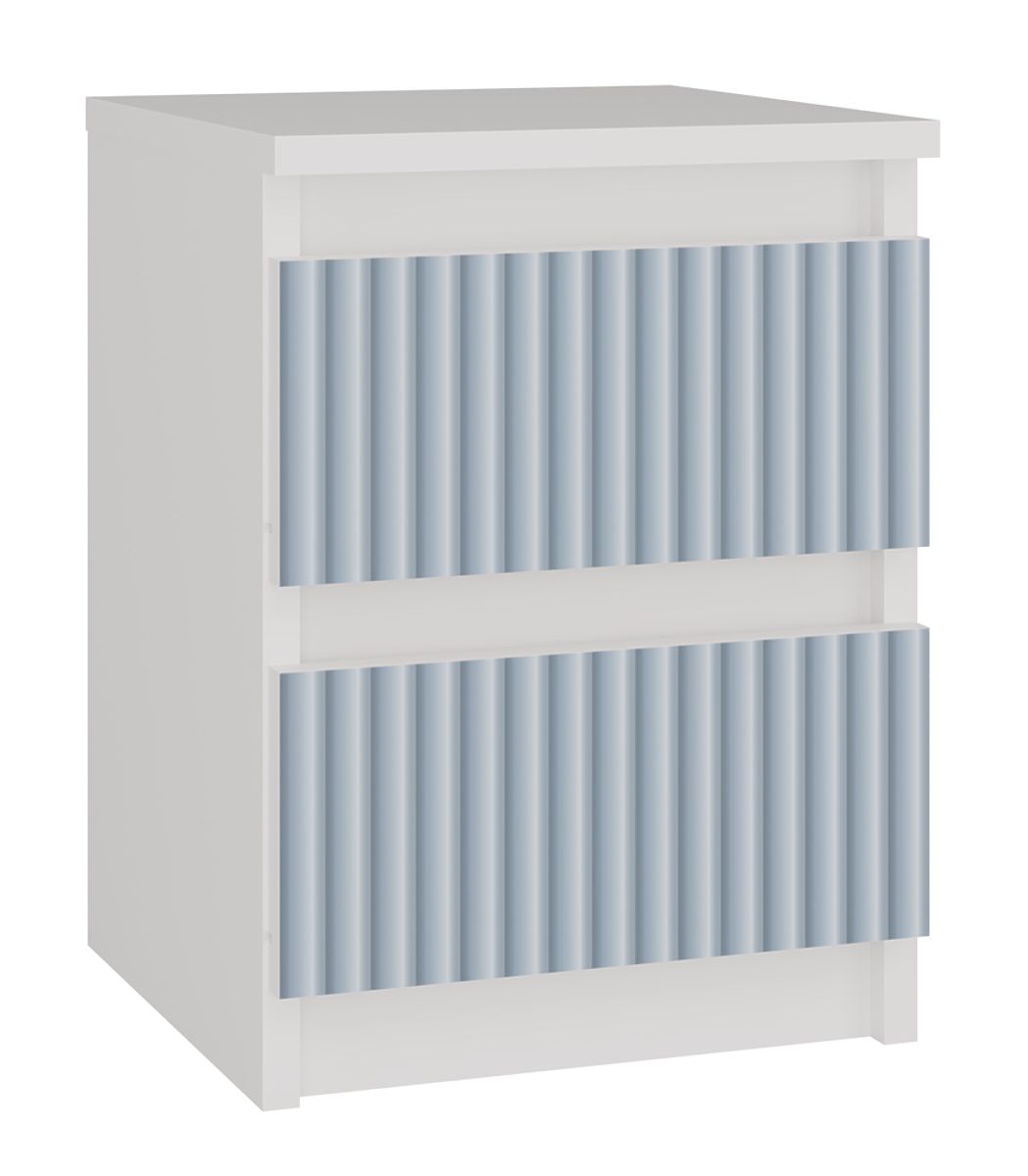 Moderni noćni ormarić s plavim uzorcima i dvije ladice. .. više
