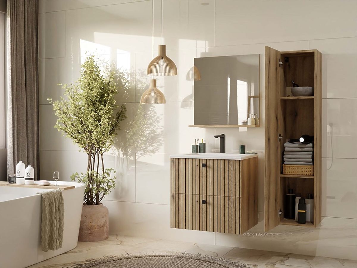 Set TIGO 60 2S s bijelim umivaonikom prilagođene širine ormariću je moderna i funkcionalna opcija za kupaonice gdje su estetika i udobnost važni. Stilizirana rebrasta prednja ploča daje karakter, dok tiho zatvaranje i metalne ručke osiguravaju udobnost pri svakodnevnoj upotrebi.