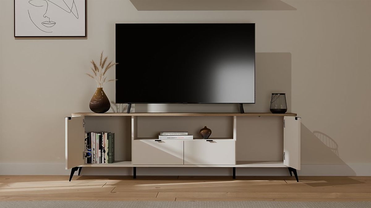 TV ormarić CORDOBA 2D2S je moderan prijedlog iz iznimne kolekcije Cordoba - spajajući eleganciju bež boje Kašmir s toplinom prirodne ploče u dekoru Hrast Castello. Minimalistički oblik, zaobljeni rubovi i izražajni detalji čine ovaj namještaj ne samo funkcionalnim, već i estetskim elementom svakog dnevnog boravka.