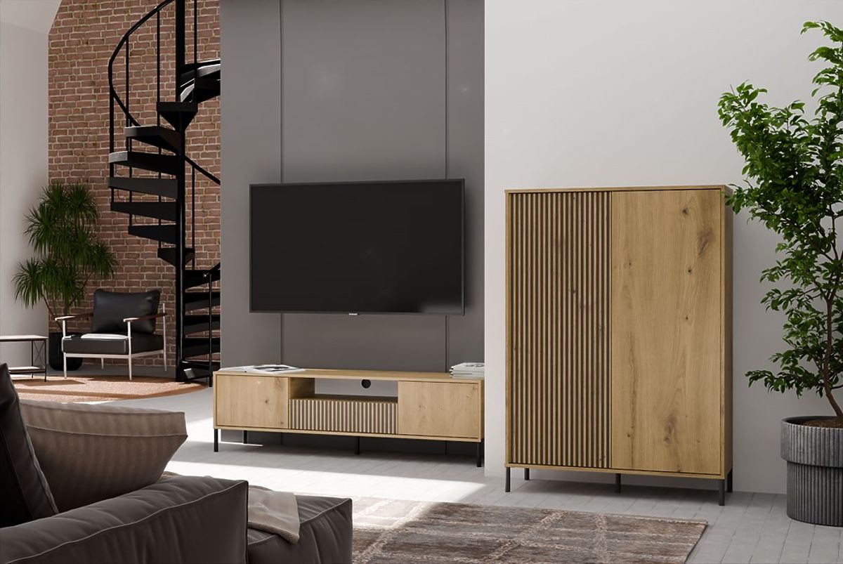BOJA:RTV ormar KAMARO je idealno rješenje za one koji cijene moderan stil i praktična rješenja. Minimalistička konstrukcija i rebraste prednje ploče daju mu izniman karakter, dok promišljeni raspored polica i ormarića omogućuje praktično skladištenje i organizaciju prostora.