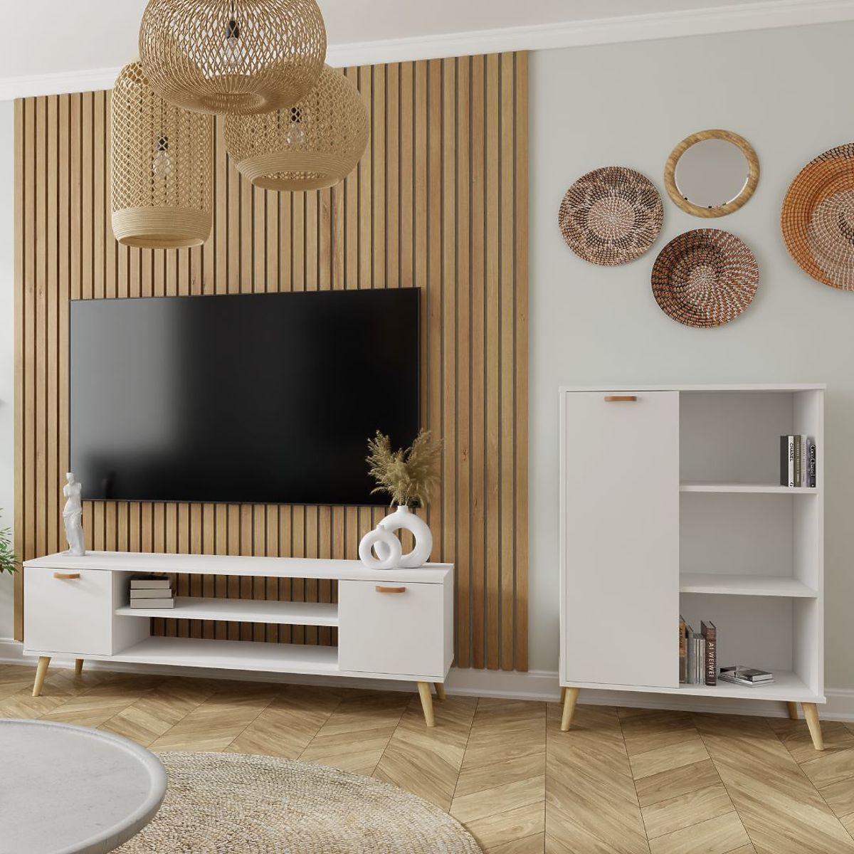 Ormar FONDI iznimno je praktičan komad namještaja koji kombinira jednostavnost s estetikom inspiriranom skandinavskim stilom. Zahvaljujući elegantnom dizajnu, savršeno se uklapa u moderne interijere, dodajući im lakoću i svježinu. Njegove prostrane police omogućuju izlaganje omiljenih dekoracija, knjiga ili fotografija, što omogućuje personalizaciju interijera i dodavanje jedinstvenog karaktera. Praktični skladišni prostori pomažu u održavanju reda i nude prostor za pohranu raznih predmeta.