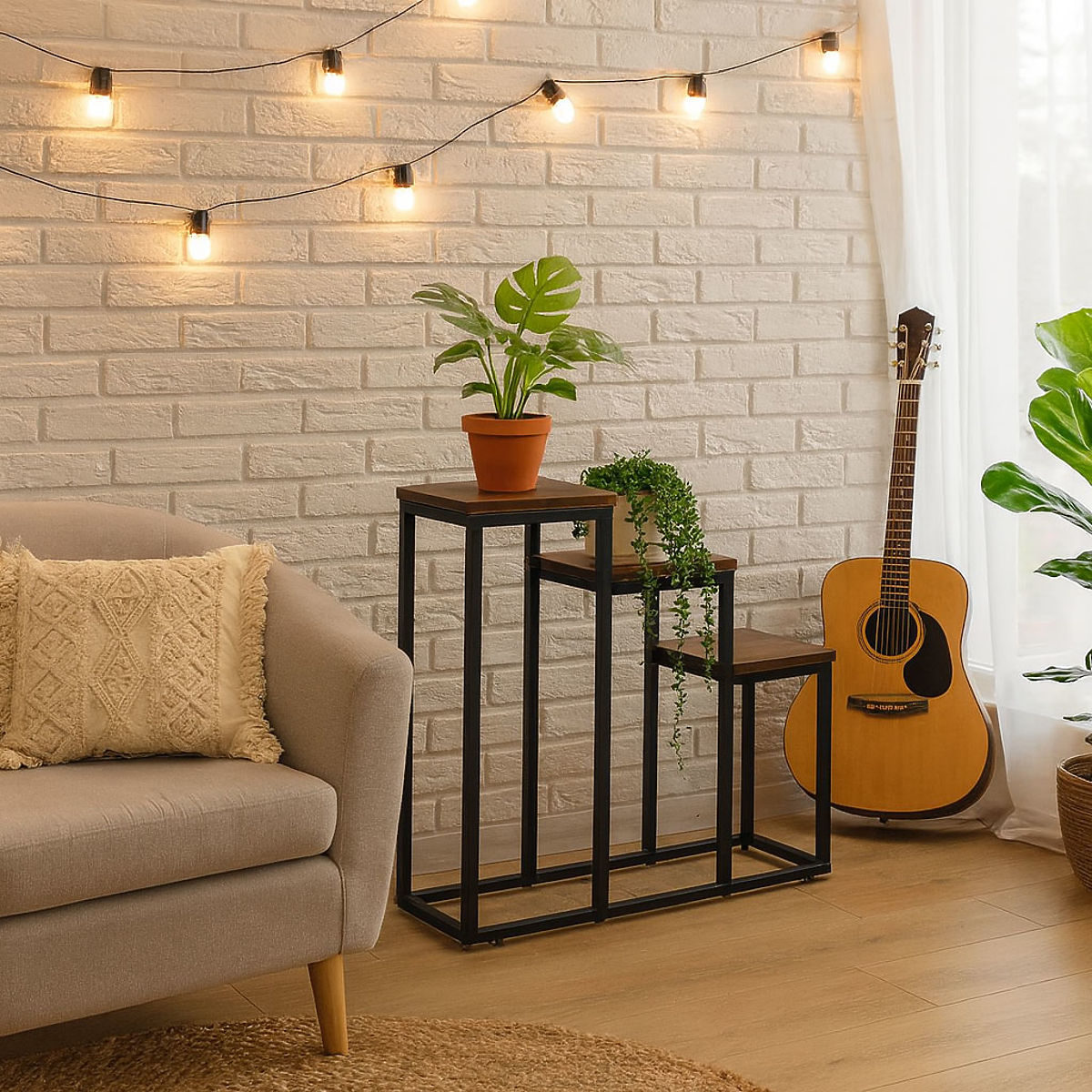 IZDRŽLJIVI MATERIJALIStalak za cvijeće je izrađen od čelika s praškastim premazom, što osigurava otpornost na koroziju i mehanička oštećenja. Police od iverice završene su u boji koja imitira prirodno drvo, što naglašava dekorativni, loft karakter namještaja.