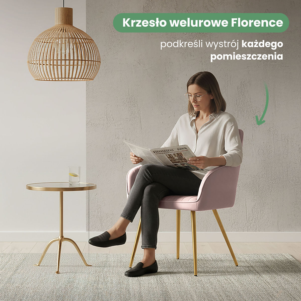 Baršunasta stolica FLORENCE odlikuje se elegantnim tapeciranjem s vertikalnim prošivom, što joj daje nježan šarm i stil. Ovisno o varijanti boje, noge stolice mogu biti crne ili zlatne, što joj daje još izvanredniji izgled. Baršunasta stolica Florence naglasit će interijer svake moderne blagovaonice i pretvoriti skromni raspored u zanimljiv i stilski prostor. Ovaj model najbolje se uklapa u interijere modernog, soft modern ili glamour stila.