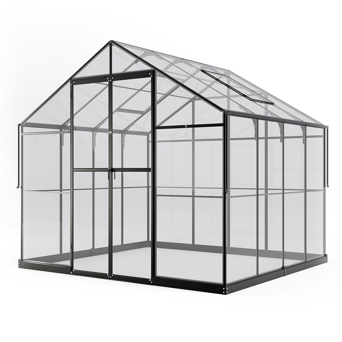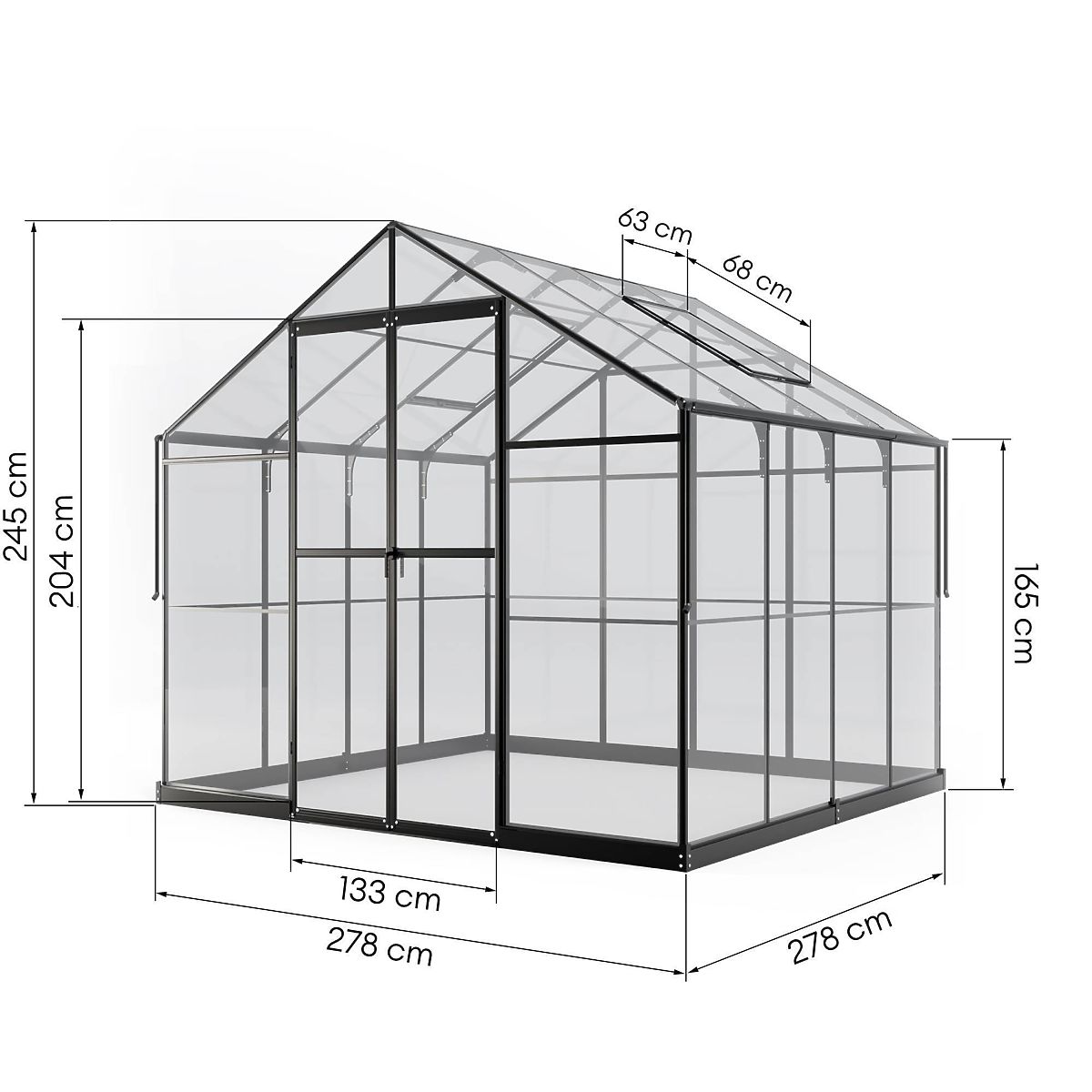 Staklenik ima čvrstu aluminijsku konstrukciju debljine 1-1,8 mm, ojačanu nehrđajućim vijcima. Dodatnu stabilnost osigurava metalna osnova visoka 12 cm. Dva preklopna prozora i dvokrilna vrata s bravom omogućuju odgovarajuću ventilaciju, što je ključno za zdrav rast biljaka i ugodan boravak u stakleniku. Niski prag na ulazu olakšava ulazak i unos opreme, kao što su kosilica ili kolica.