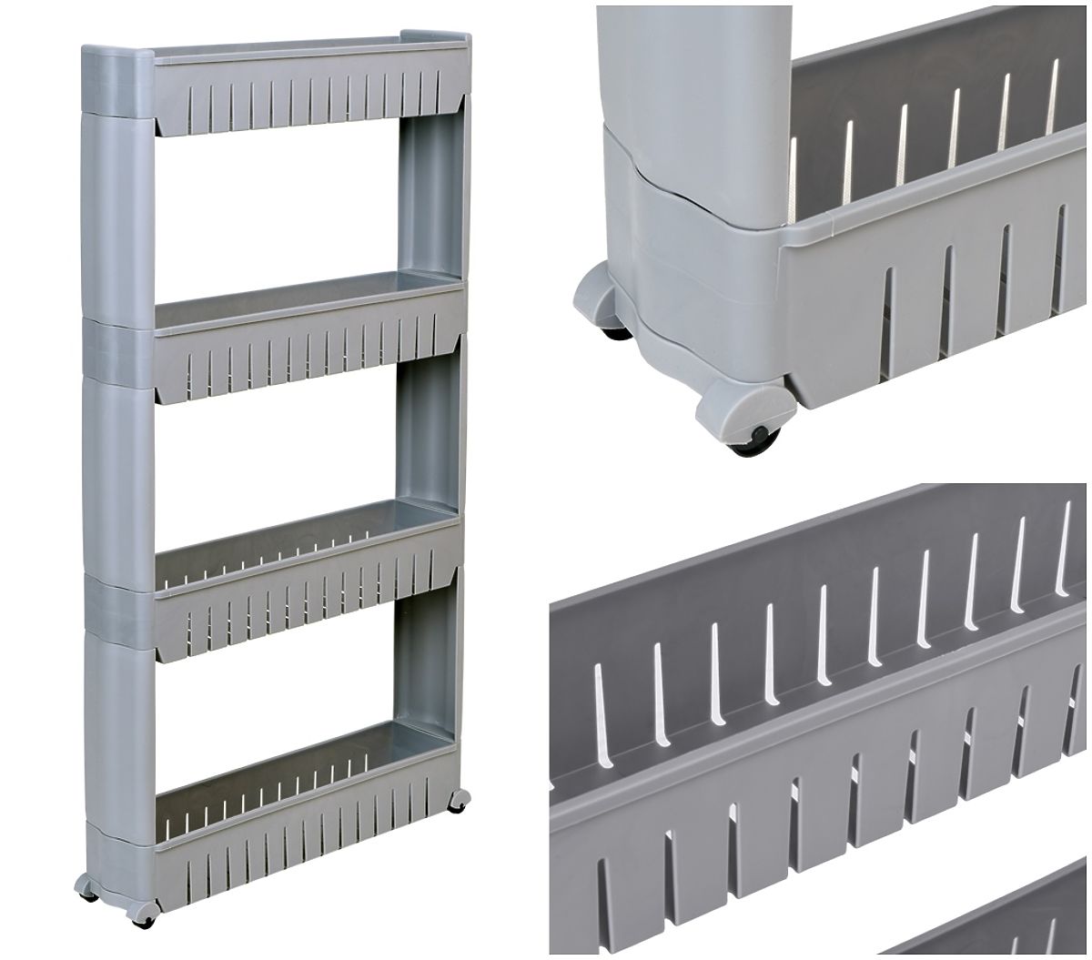 Mobilni ormarić idealan za uske prostore, kao što su kuhinja ili kupaonica. Njegova modularna konstrukcija od izdržljive plastike omogućuje jednostavno prilagođavanje potrebama – police se mogu dodavati ili uklanjati. Zahvaljujući kompaktnoj veličini, savršeno se uklapa između ormarića i hladnjaka, perilice rublja ili na druga teško dostupna mjesta. Kuhinjski regal je izvrstan za pohranu začina, kuhinjskih dodataka, kozmetike, sredstava za čišćenje i mnogih drugih neophodnih stvari. Mobilnost osiguravaju četiri kotačića, zahvaljujući kojima se kupaonski ormarić na kotačićima lako premješta tamo gdje je potreban.