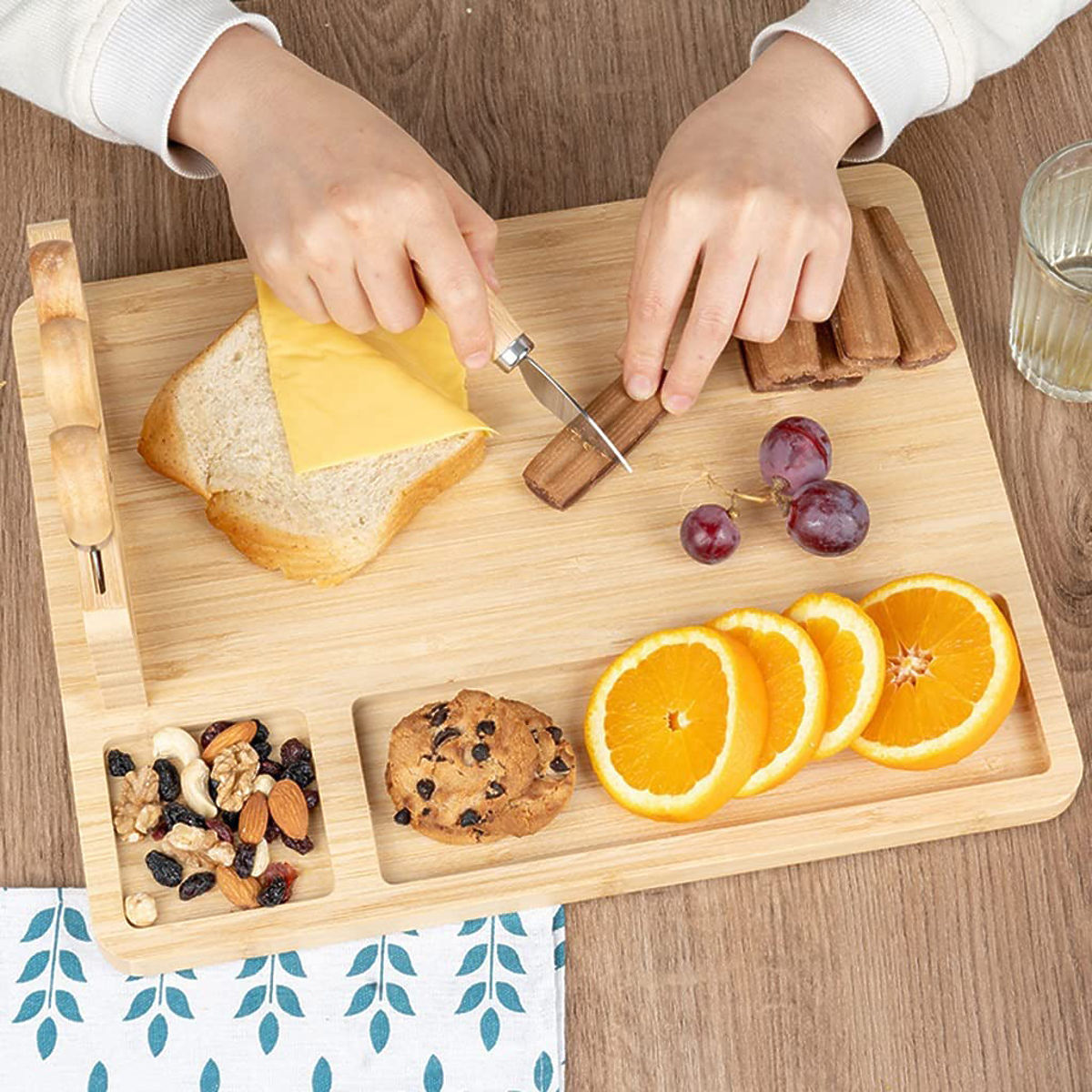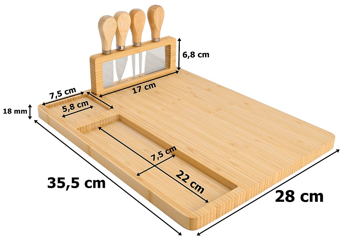 Daska za sir i grickalice Salers s priborom Namjena: priprema i prezentacija grickalica ⭐️ Odlično za posluživanje sireva i drugih grickalica! ⭐️ Izrađeno od 100% bambusovog drveta ⭐️ Stalak s kompletom noževa od nehrđajućeg čelika ⭐️ Sjajna ideja za poklon ⭐️ Kupnja od proizvođača ✨Daska za sir Salers s kompletom noževa od nehrđajućeg čelika - Poslužite sireve kao profesionalac!✨ Daska za sir Salers je elegantan i praktičan način za posluživanje sireva i grickalica koji će impresionirati vaše goste. Izrađena od 100% prirodnog bambusa, ne samo da izgleda lijepo, već je i izdržljiva i jednostavna za održavanje. Zahvaljujući posebnom stalku s noževima od nehrđajućeg čelika, sve što vam treba je pri ruci, a udubljenja na rubovima omogućuju efektno izlaganje dodataka. Idealna za zabave, obiteljska okupljanja i kao ideja za poklon, daska Salers spaja funkcionalnost, estetiku i izdržljivost, čime eliminira brige o nedostatku prikladnih dodataka ili neredu na stolu. Karakteristike Materijal: 100% bambus Uključuje: daska + komplet pribora od nehrđajućeg čelika na stalku Dimenzije Širina: 35,5 cm Dubina: 28 cm Visina: 1,7 cm Dodatne informacije Prikazane boje treba smatrati orijentacijskim - mogu se razlikovati od stvarnih zbog različitih postavki monitora i procesa uređivanja fotografija. Stvarne dimenzije mogu se razlikovati od gore navedenih. Tolerancija pogreške može biti +/- 5%. Marka: Gockowiak EAN kod: 326015MG Materijal: prirodni bambus Debljina daske: 1,5 cm Širina: 35,5 cm Duljina: 28 cm Broj noževa: četiri