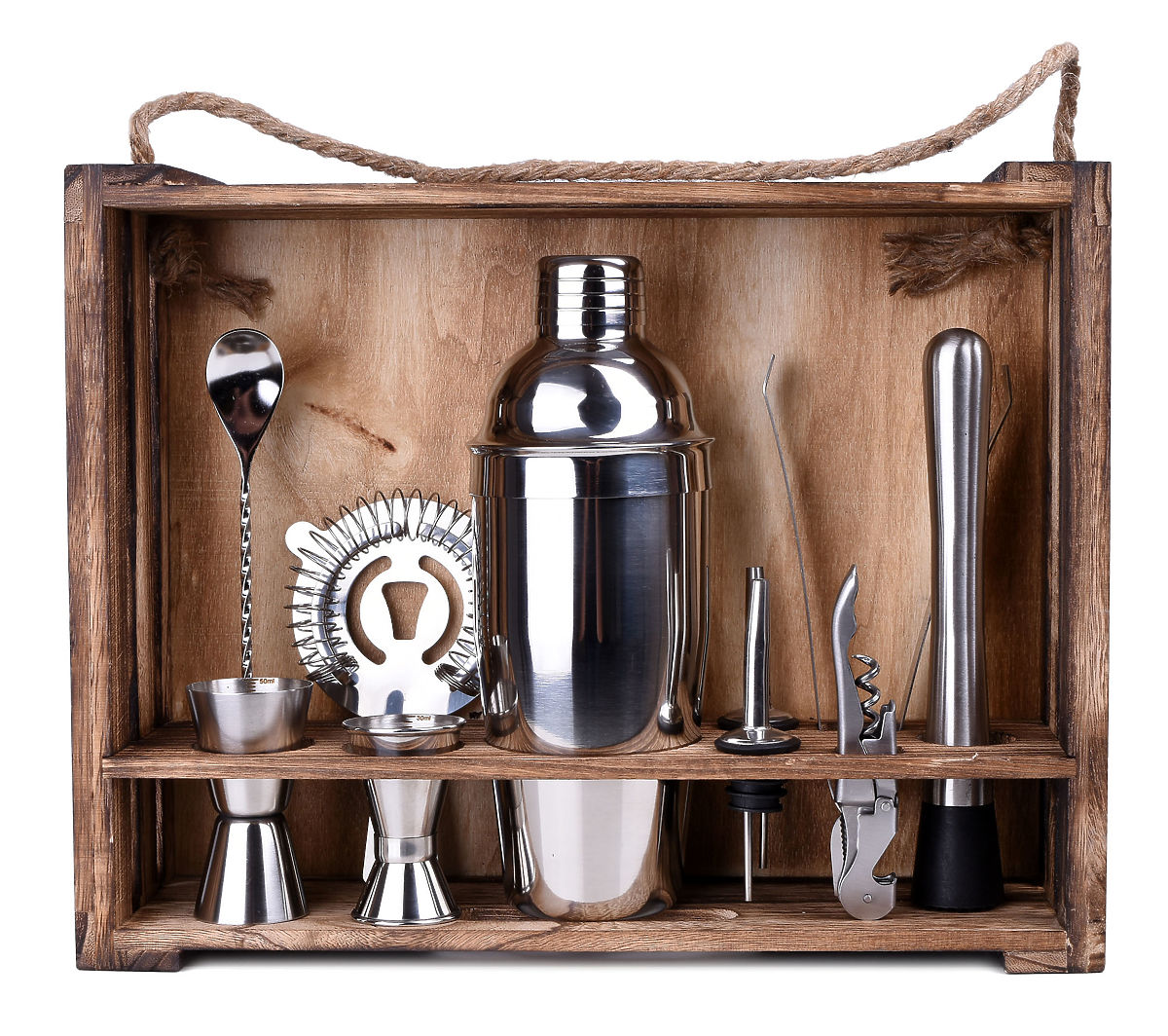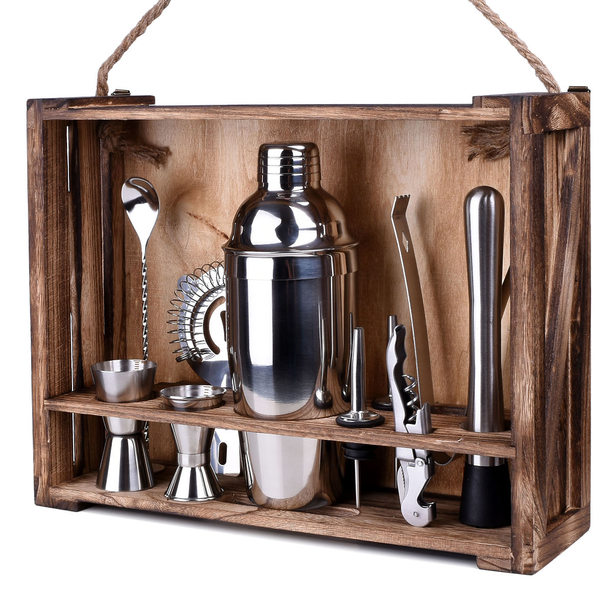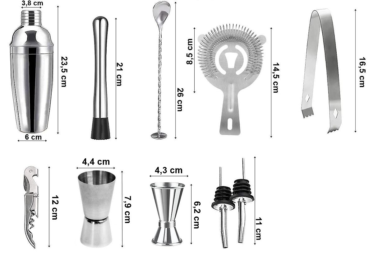 Organizirate zabavu i želite iznenaditi svoje goste? Set za barmene pomoći će vam da pokrenete zabavu i pripremite originalne, zanimljive koktele. Svaki element seta izrađen je od najkvalitetnijeg nehrđajućeg čelika, što ne mijenja okus pića. Set sadrži čak 11 elemenata: 10 nehrđajućih dodataka i stalak od borovog drva podvrgnut karbonizaciji.