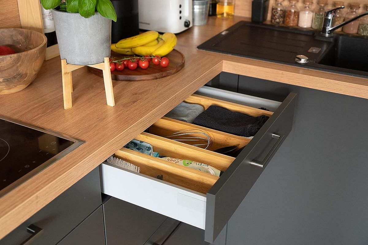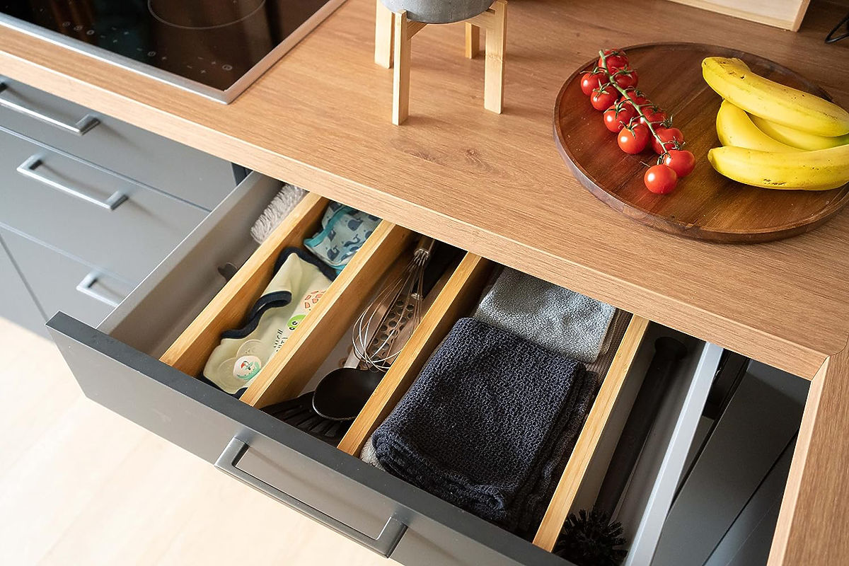 Predstavljamo set bambusovih pregrada za ladicu RITA - idealno rješenje za učinkovitu organizaciju u ladicama. Izrađene od odabranog bambusa najviše kvalitete, ovaj set unosi prirodni red u vašu kuhinju ili ured. Sadrži pažljivo izrađene pregrade s podesivom duljinom, koje se prilagođavaju različitim veličinama ladica. Bambusove pregrade RITA nisu samo funkcionalne, već i ekološko rješenje.