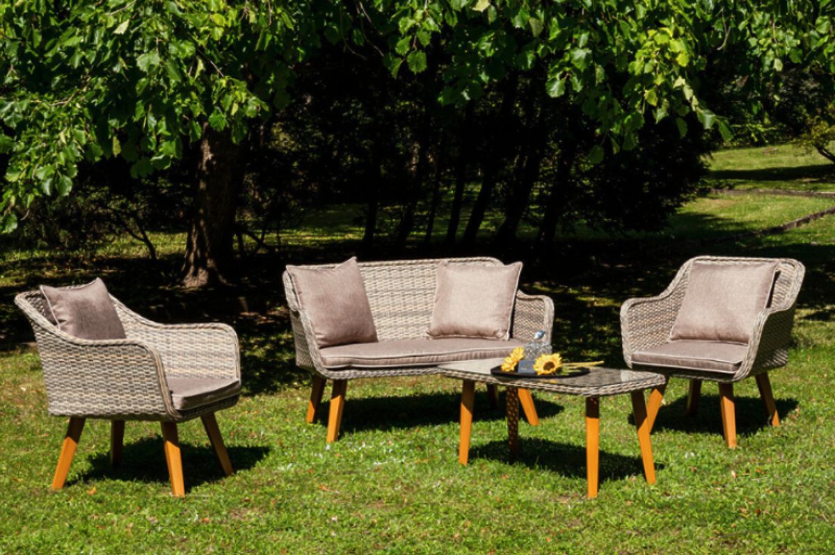 Elegantan vrtni set od tehnoratana (2 x udobna fotelja, sofa + stol) LARGO siva neujednačena