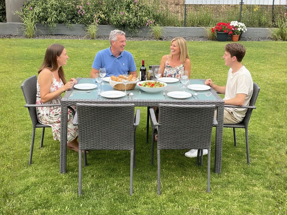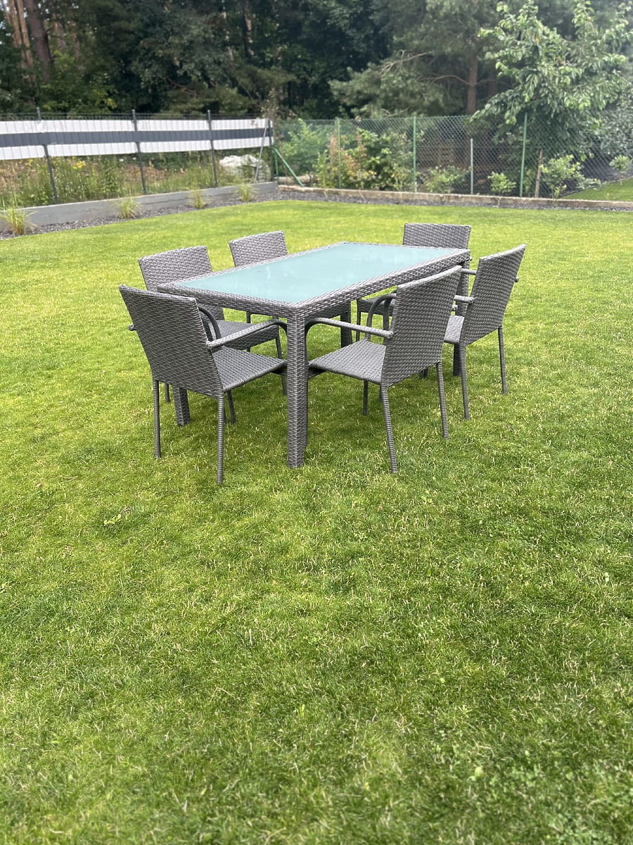 Set blagovaonskog namještaja AVVICENTE dizajniran je za ljubitelje stilskih, ali istovremeno praktičnih rješenja i savršen je dodatak svakom vanjskom prostoru. Lagana konstrukcija stola omogućuje jednostavno premještanje, što nudi iznimnu svestranost i omogućuje prilagodbu aranžmana individualnim potrebama. Vrtni namještaj od tehnoratana ne samo da očarava svojom elegancijom, već također jamči otpornost na kišu, jako sunčevo zračenje i mraz, čime se eliminira potreba za intenzivnim održavanjem. Osim toga, udobne stolice pružaju maksimalnu udobnost odmora, čineći svaki trenutak proveden na svježem zraku još ugodnijim. Set vrtnog namještaja AVVICENTE sinonim je za trajnost i eleganciju, savršeno ispunjavajući potrebe modernih korisnika koji traže namještaj koji će služiti godinama. Boja seta AVVICENTE: siva, četkana struktura Pletenje: tehnoratan 7-8mm x 1,2mm Konstrukcija namještaja: stol - aluminij, stolice - čelik Set se sastoji od 7 elemenata: 1 x stol (s mat staklenom pločom od 5mm sigurnosnog stakla): duljina: 150 cm širina: 90 cm visina: 74 cm 6 x stolica: širina: 56 cm dubina: 50 cm visina: 84 cm visina od poda do sjedala: 44 cm visina naslona od sjedala: 43 cm širina sjedala: 40 cm dubina sjedala: 43 cm Set se šalje na 1 paleti dimenzija 120x80x170 cm, težina 60 kg Mogućnost kupnje jastuka za stolice ovdje. Stolice se mogu odmah koristiti nakon vađenja iz kutija. Stolice su složive (mogućnost umetanja jedne u drugu), što olakšava skladištenje i namještaj ne zauzima puno prostora. Stol je namijenjen jednostavnoj, samostalnoj montaži prema priloženim uputama. Mat staklena ploča stola ugrađena je u tehnoratanski okvir. Tehnoratan je otporan na štetne vremenske uvjete, no za još dulje očuvanje nepromijenjenog izgleda namještaja preporučujemo kupnju zaštitnog pokrova. Pokrov tamno sive boje je jednodijelan i ima donju vezicu. Svi pokrovi su izrađeni po narudžbi, a vrijeme izrade je cca 14 radnih dana. Zamislite vrtni namještaj koji nadmašuje vaša očekivanja u svakom pogledu – od izdržljivosti do dizajna. To je BELLO GIARDINO, gdje svaki detalj ima značenje i luksuz se susreće s funkcionalnošću: Nepromjenjiva kvaliteta: Naš sintetički ratan jamči da će namještaj trajati godinama, bez gubitka ljepote ili trajnosti. Otpornost na vremenske uvjete: Naš namještaj podnosi najteže vremenske uvjete, od užarenog sunca do ledenih zima, ostajući uvijek lijep. Luksuzna udobnost: Debeli, mekani jastuci pozivaju na opuštanje, nudeći udobnost koju je teško pronaći drugdje. Lakoća i čvrstoća: Aluminijska konstrukcija spaja najbolje od oba svijeta – lagana je, ali iznimno stabilna. Dizajn koji očarava: Svaki element našeg namještaja dizajniran je s obzirom na estetiku i funkcionalnost, kako bi se uklopio u svako okruženje. Bilo da ste ljubitelj minimalizma ili cijenite bogate, elegantne aranžmane, naš namještaj će ispuniti vaša očekivanja, nadmašujući granice uobičajene funkcionalnosti i estetike. Jamčimo da ni najzahtjevniji kupci neće odoljeti udobnosti i stilu koji nudi BELLO GIARDINO. Učinite svoj vrt, terasu ili balkon oazom opuštanja i elegancije koju ste oduvijek željeli imati. Ne čekajte, otkrijte BELLO GIARDINO već danas i pretvorite svoje vanjske prostore u mjesta o kojima ste oduvijek sanjali. Fotografije namještaja od naših kupaca:
