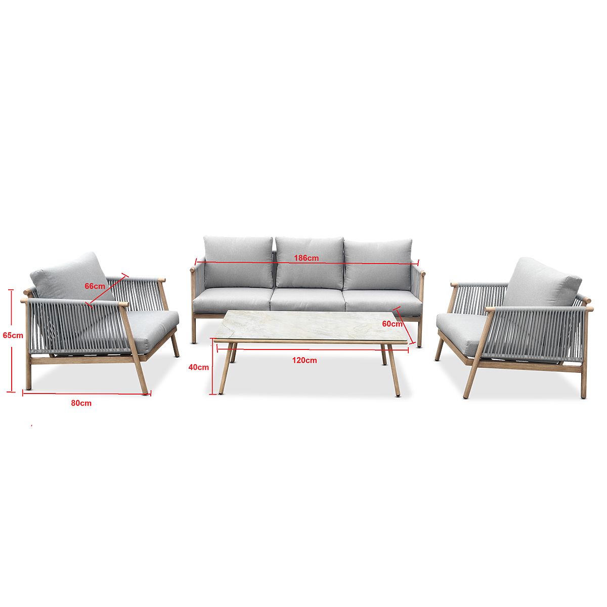 DOSTAVA PLANIRANA ZA POČETAK TRAVNJA 2026. Transformirajte svoj vanjski prostor i stvorite luksuznu zonu za opuštanje s kompletnim setom namještaja BLANDO. Ovaj 4-dijelni set je kvintesencija moderne elegancije koja spaja sirovu izdržljivost metala s umjetničkom izvedbom od pletene sintetičke užadi. Set, koji se sastoji od prostrane sofe, dvije duboke fotelje i stolića za kavu, idealan je za terasu, vrt ili veliki patio, gdje će postati središnja točka ljetnih okupljanja. Konstrukcija namještaja BLANDO temelji se na čvrstom aluminijskom okviru, koji je lagan i istovremeno potpuno otporan na hrđu i mehanička oštećenja. Jedinstveni karakter seta naglašava estetsko pletivo od fleksibilne užadi, koja je otporna na promjenjive vremenske uvjete. Izvanrednu udobnost osiguravaju debeli, 10-centimetarski jastuci i duboka sjedišta, koja omogućuju potpuno opuštanje. Praktično poboljšanje su skidive navlake, koje olakšavaju održavanje čistoće tijekom cijele sezone. Tehnička specifikacija: Naziv modela: BLANDO Tip seta: Set za opuštanje (3-mjestna sofa + 2 fotelje + stolić za kavu) Materijal: Aluminij (okvir), sintetička užad (pletivo) Dimenzije 3-mjestne sofe: Širina: 186 cm Dubina: 66 cm Visina: 66 cm Dimenzije fotelje (2 kom): Širina: 66 cm Dubina: 80 cm Visina: 66 cm Dimenzije stolića za kavu: Duljina: 120 cm Širina: 60 cm Visina: 40 cm Sjedište (sofa i fotelje): Visina (bez jastuka): 26 cm Debljina jastuka: 10 cm Ostale značajke: Otpornost na koroziju i vremenske uvjete, skidive navlake jastuka, lagana konstrukcija, moderan dizajn. Set vrtnog namještaja BLANDO je izvrsna investicija u premium kvalitetu, koja spaja rafinirani stil s dugotrajnošću na godine. Njegov univerzalni izgled osigurava da se uklapa kako u moderne, tako i u klasične aranžmane. Odaberite set BLANDO i uživajte u udobnosti na najvišoj razini u svojoj privatnoj zoni za opuštanje.