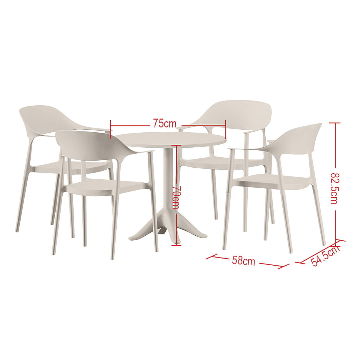 Pretvorite svoj balkon, terasu ili vrtni kutak u savršeno mjesto za opuštanje uz set namještaja VITA. Ovaj set od 5 dijelova savršena je kombinacija modernog dizajna i praktičnih rješenja koja odgovaraju svakom vanjskom prostoru. Set VITA izrađen je od visokokvalitetne, izdržljive plastike, što ga čini potpuno otpornim na vremenske uvjete – ne smetaju mu kiša ni UV zračenje. Zahvaljujući tome, namještaj zadržava svoj estetski izgled kroz mnoge sezone bez potrebe za složenim održavanjem. Set uključuje četiri ergonomski oblikovane stolice koje osiguravaju udoban odmor i stabilan okrugli stol idealan za posluživanje jutarnje kave ili ljetnih obroka. Lagana konstrukcija namještaja omogućuje jednostavno premještanje i lako uređenje prostora, a kompaktne dimenzije stola znače da se set savršeno uklapa i u manje prostore. To je izbor za one koji cijene udobnost, lako održavanje i univerzalni stil. Tehnička specifikacija: Naziv modela: VITA Tip seta: Set za blagovanje i kavu (stol + 4 stolice) Materijal: Visokokvalitetna plastika Dimenzije stolice: Širina: 58 cm Dubina: 54,5 cm Visina: 82,5 cm Dimenzije stola: Promjer ploče: 70 cm Visina: 75 cm Oblik ploče: Okrugli Dodatne značajke: Otpornost na vlagu i vremenske uvjete, lako održavanje, lagana konstrukcija.