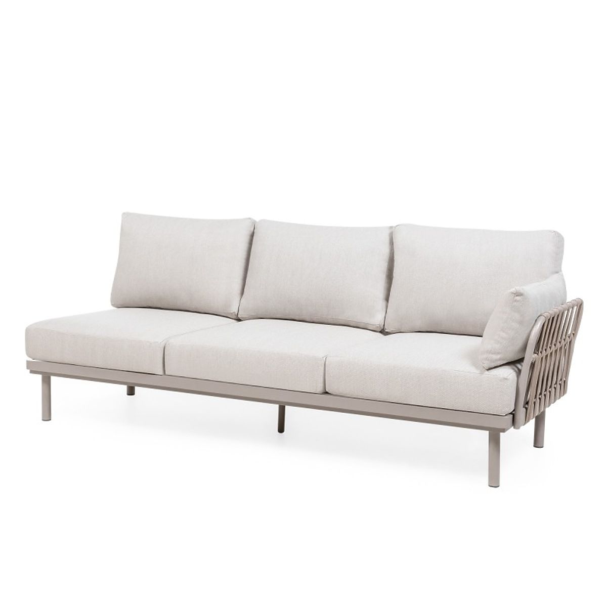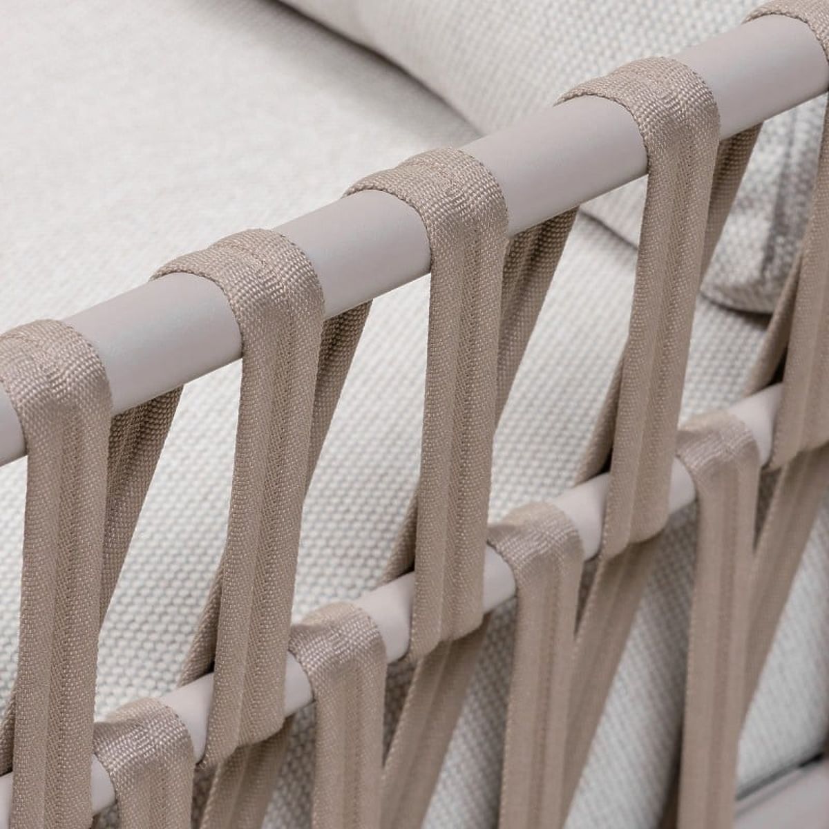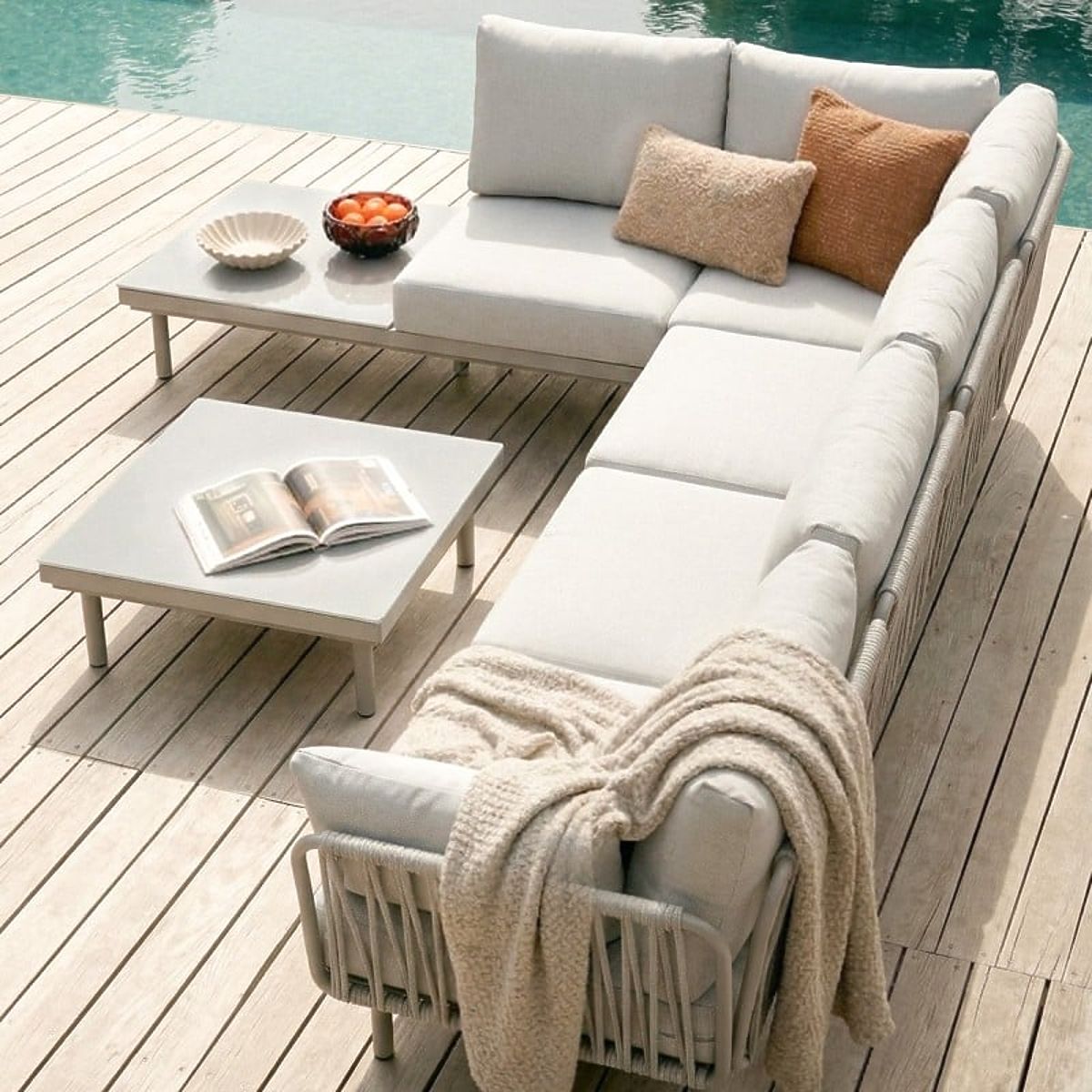 Kutna garnitura Amarello – nježna elegancija u harmoničnom obliku. Aluminijska konstrukcija u bež-sivoj nijansi, izdržljivo pletivo i udobni jastuci stvaraju sofisticirani prostor za opuštanje, dopunjen praktičnim stolom i bočnom policom.