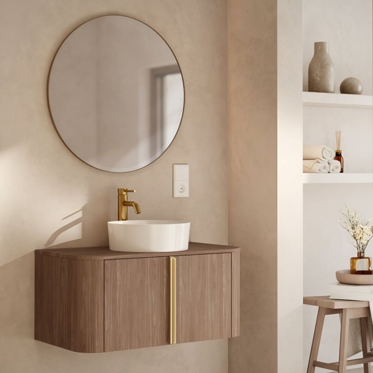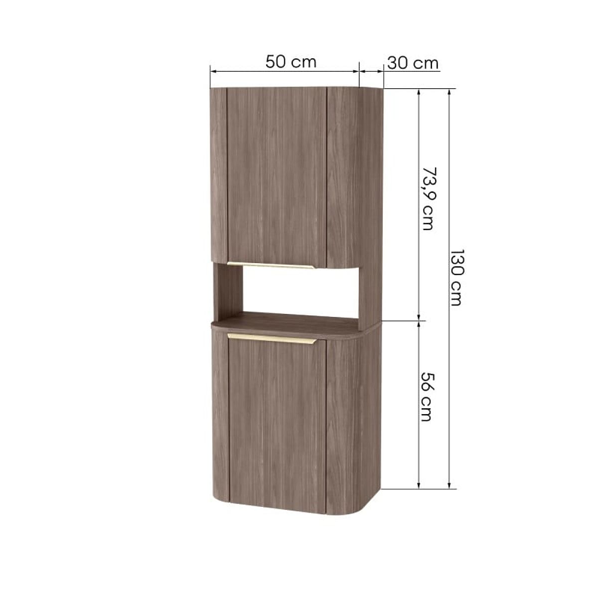 Upoznajte kupaonski stup Bassa, koji spaja nježnu eleganciju s iznimnom funkcionalnošću. Njegova moderna nijansa oraha lincoln i zaobljeni oblici, obogaćeni zlatnim ručkama, unijet će jedinstvenu atmosferu u vašu kupaonicu.